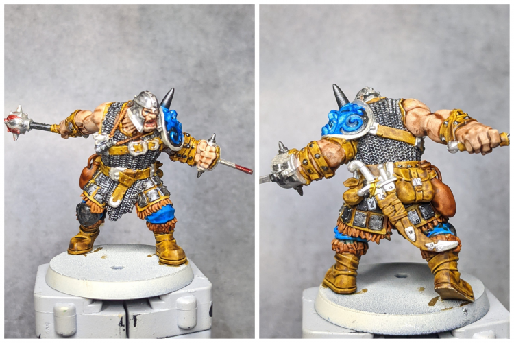 After that, I came in with Contrast: Gore-grunta Fur and smoshed in the fur trim and jug. I wanted some more Contrast Talassar Blue on the model so I went straight over the silver on the pauldron for a quick metallic sheen. After that, I splashed on some GW Technical Blood For The Blood God on the weapons.
