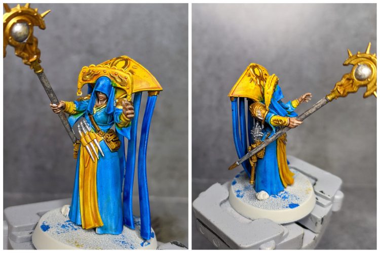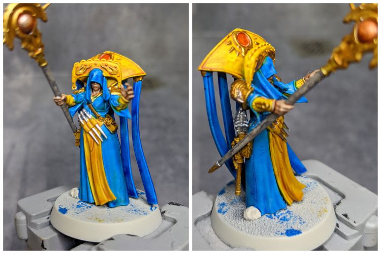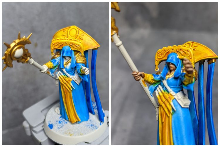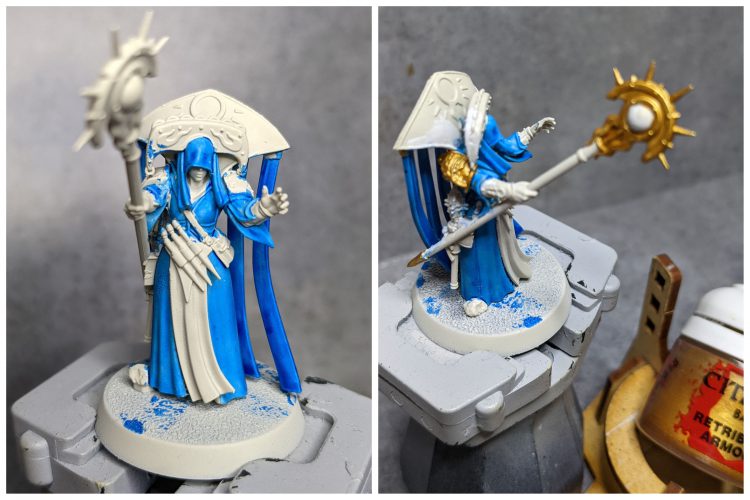 Cleona Zeitengale WiP - Credit BeanithSince I'm planning on linking all of my hereos using Contrast Talassar Blue as a spot colour somewhere on the model and Cleona Zeitengale seems to me as one of the more good Good Guy, I decided to make the bulk of her cloth blue. After that I busted out some Base Retributor Armour on her staff, robe trim and shoulders.