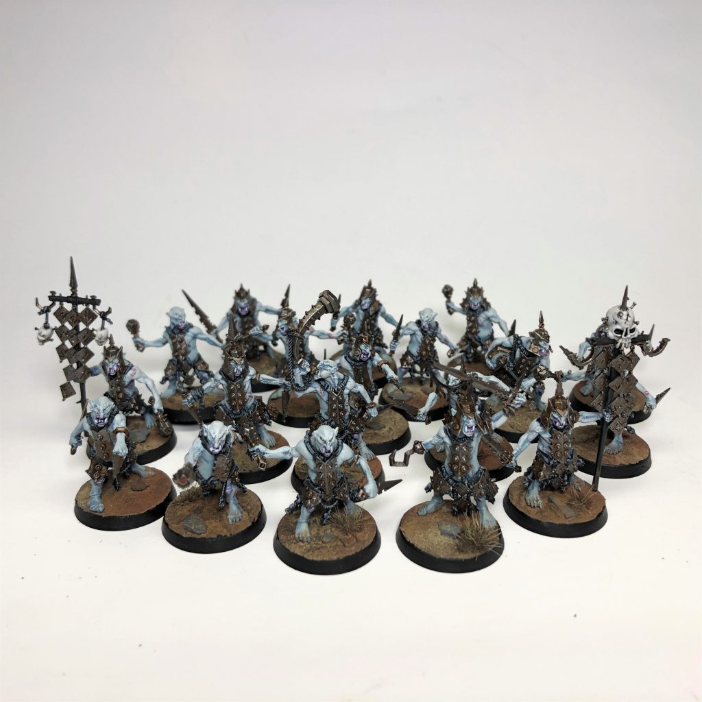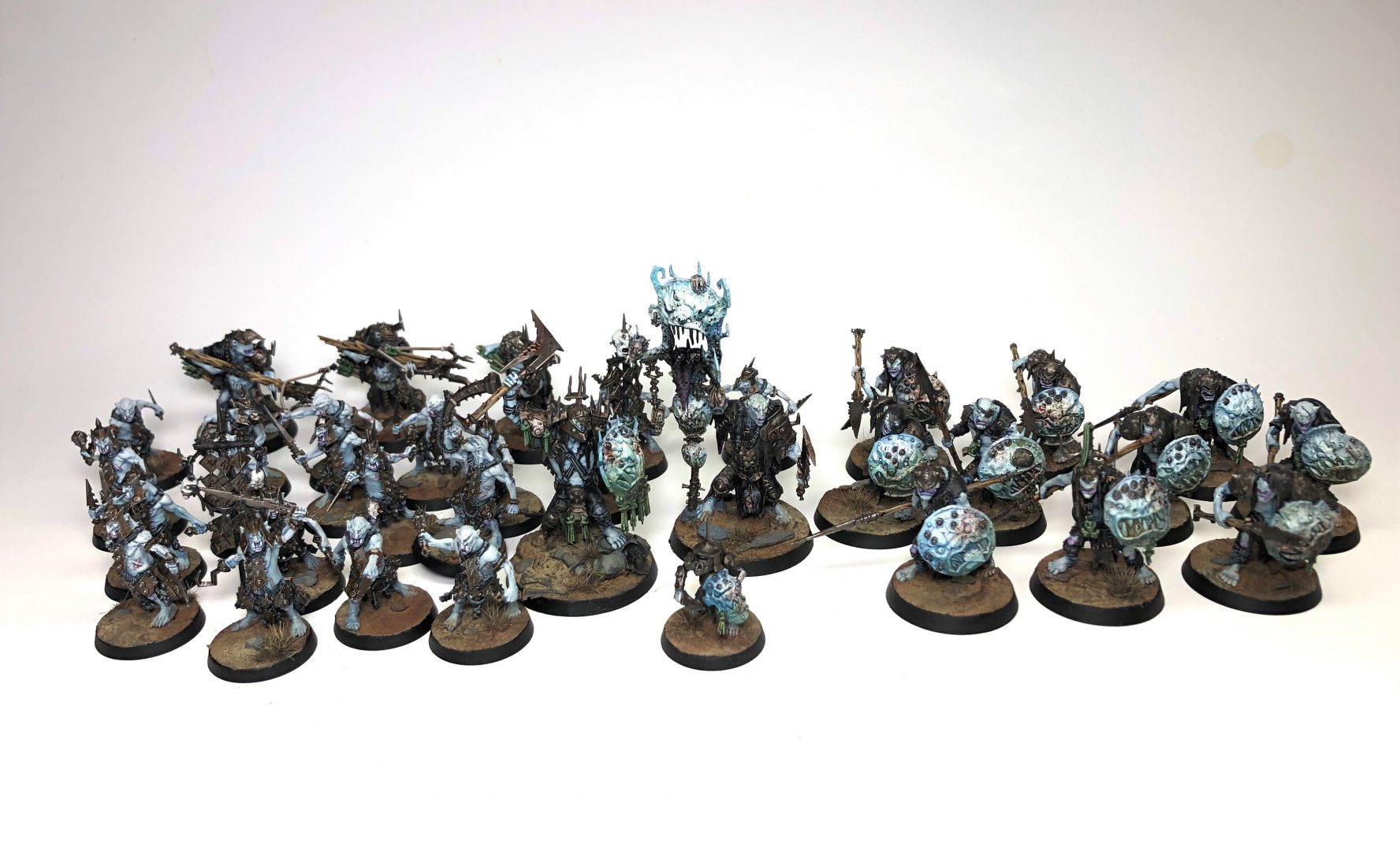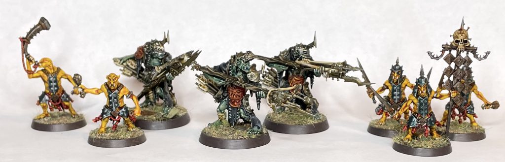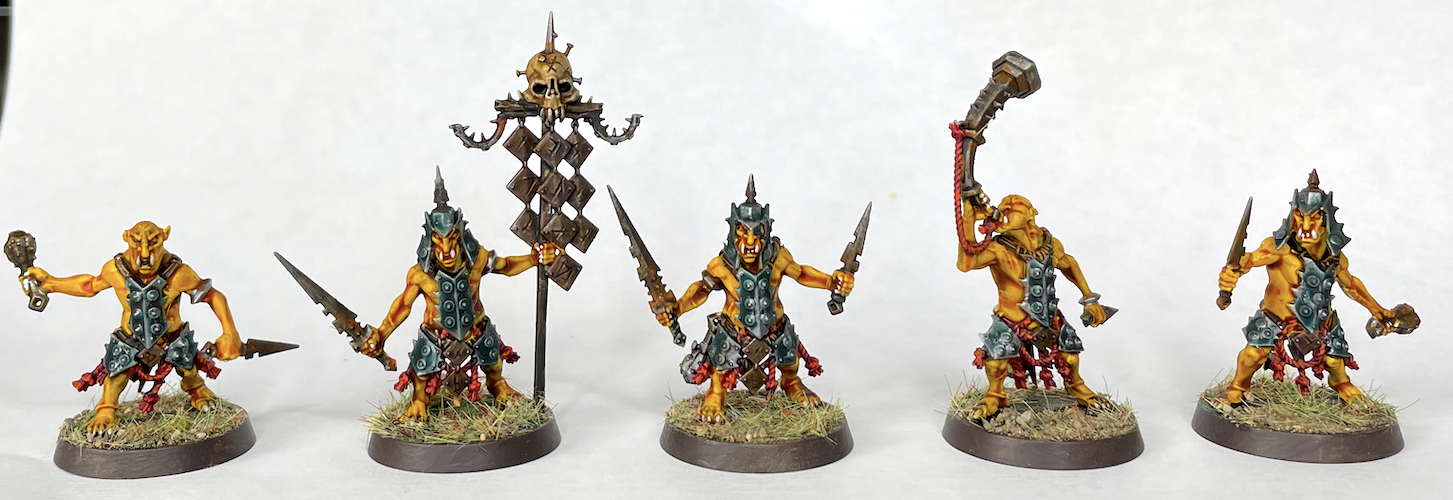 As with all my Kruleboyz, I wanted the Hobgrots to have the pale blue flesh of creatures who aren't accustomed to seeing much sunlight. I also figured they wouldn't have access to a wide array of materials to make armor/clothes/kit, so there's a very utilitarian feel to their gear. It also has the added bonus of being very efficient to paint and it helps to unify the scheme across a very diverse set of models. This scheme is very straightforward, but also very effective. I use a LOT of non-GW paints on my models. You can achieve the same results with GW paints in similar colors, I just use other paint lines and have for a long time. The exact paints are less important than the colors and the techniques!My Kruleboyz so far:
