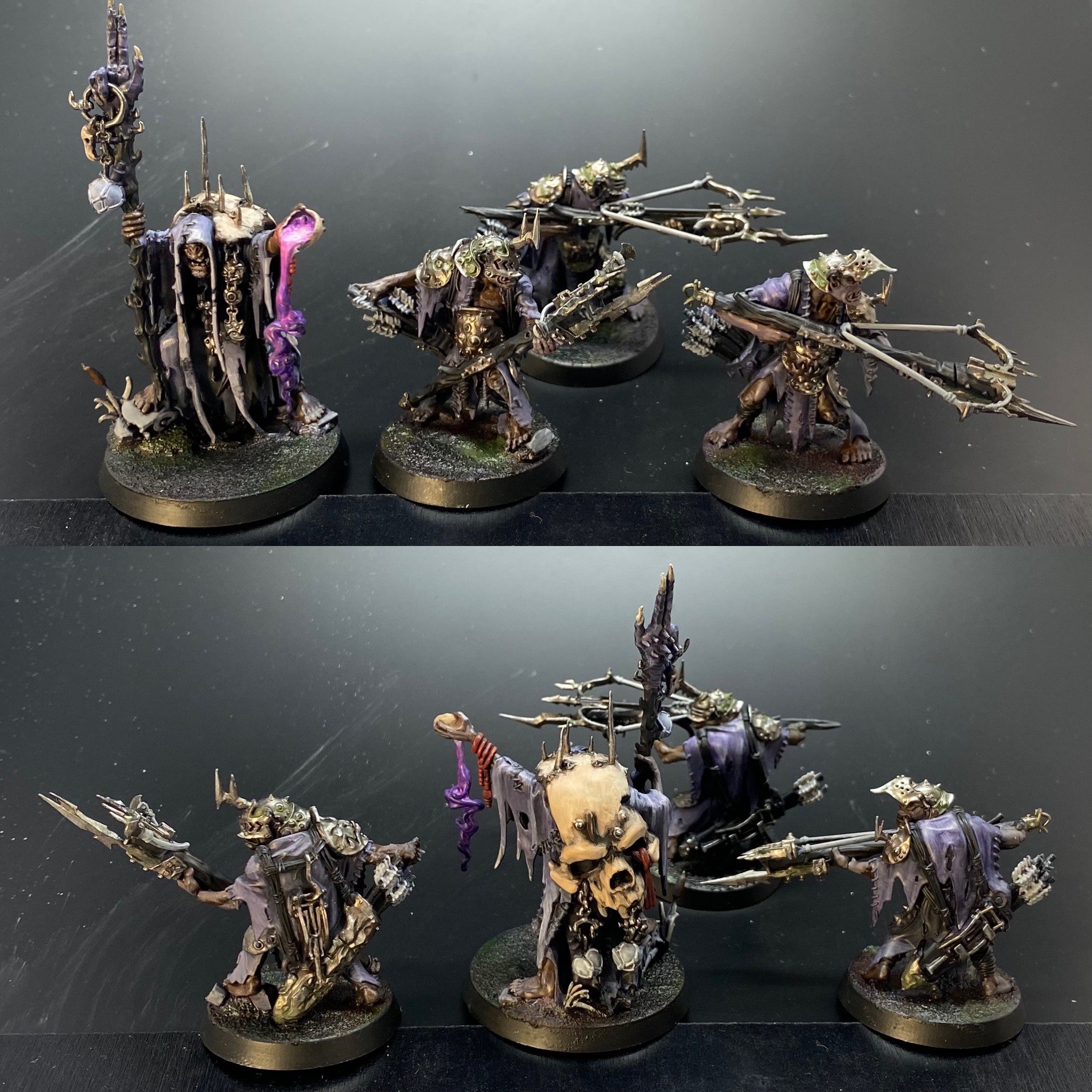 - Create a Zenithal undertone by painting them Rhinox Hide, Ushabiti Bone, and Skull White.