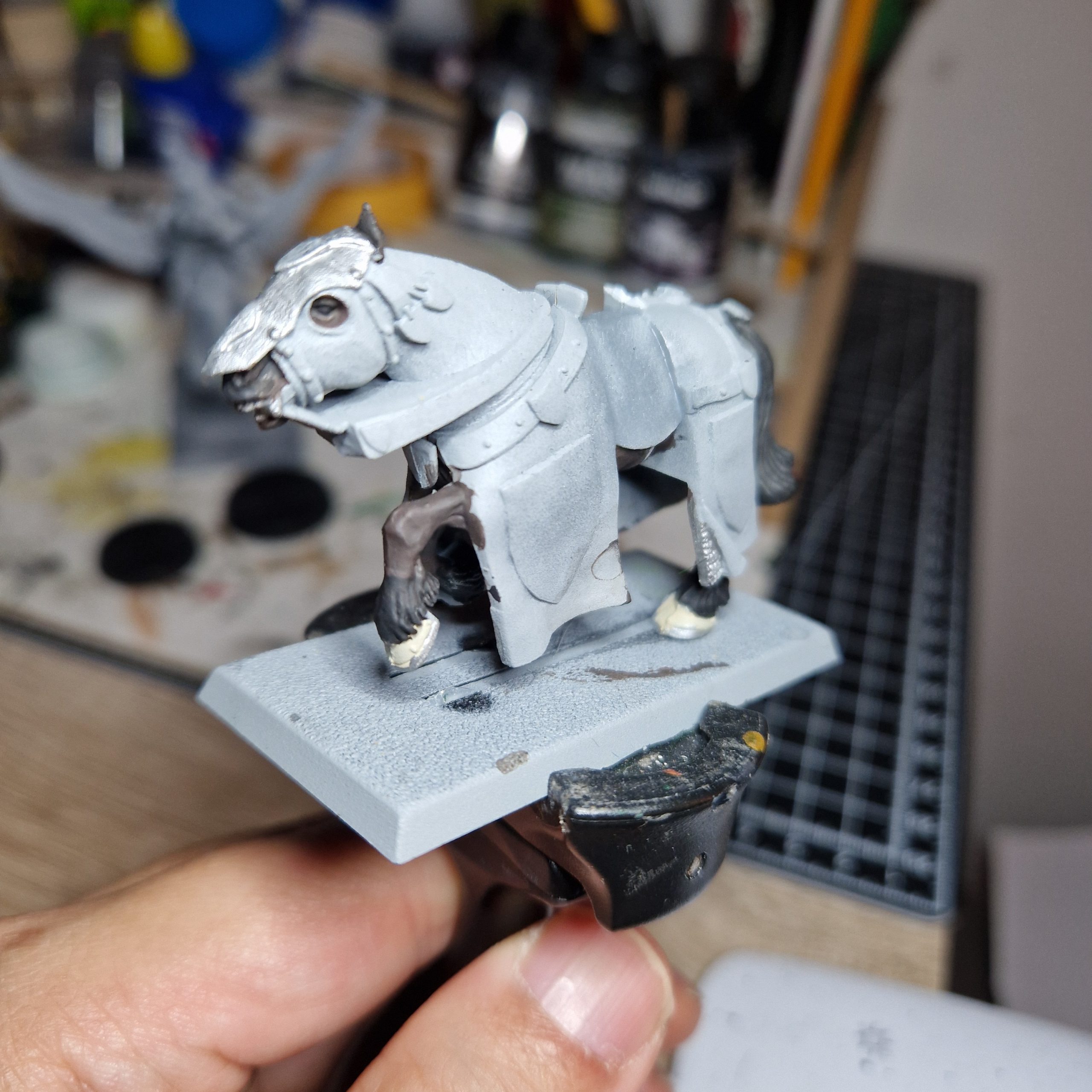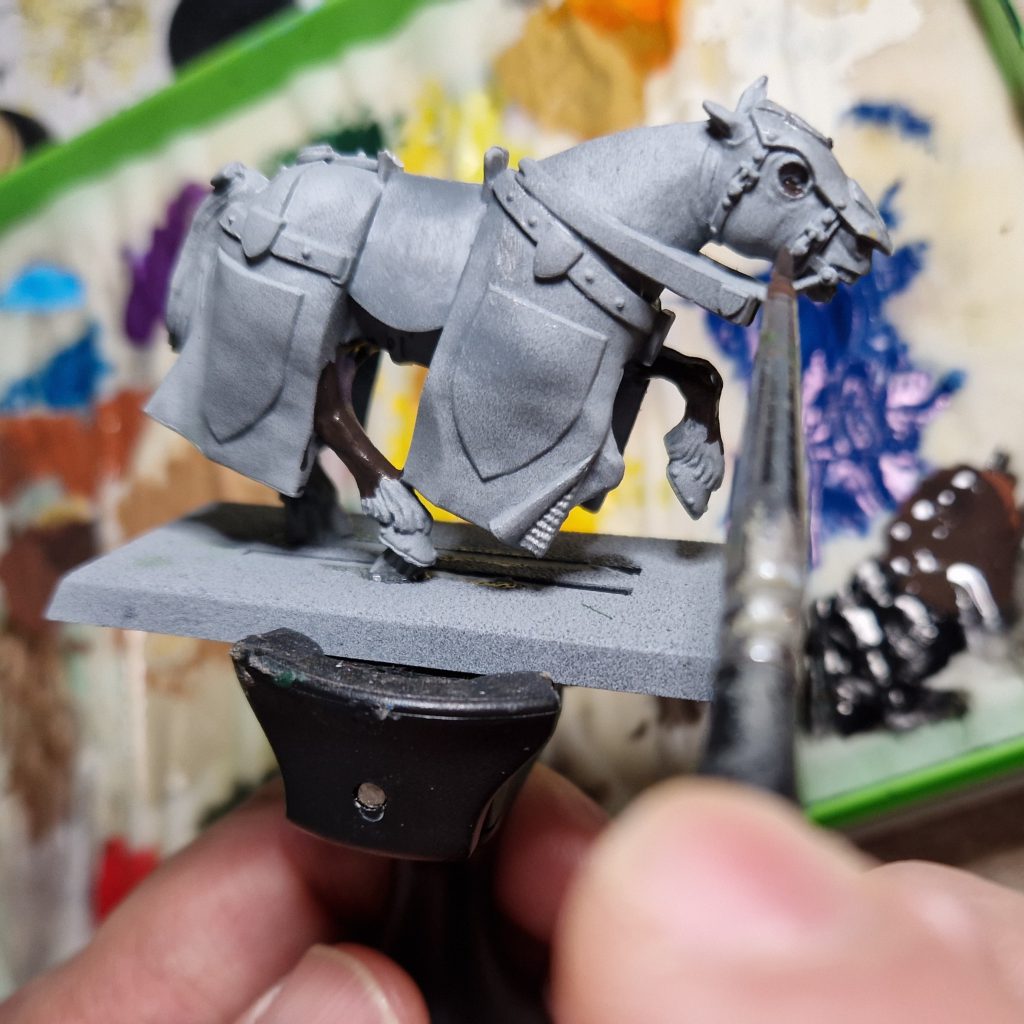 Horse, points, hooves, armour, horseshoes. Note I have been less than careful here on parts which I am going to paint over anyway. On to the barding!