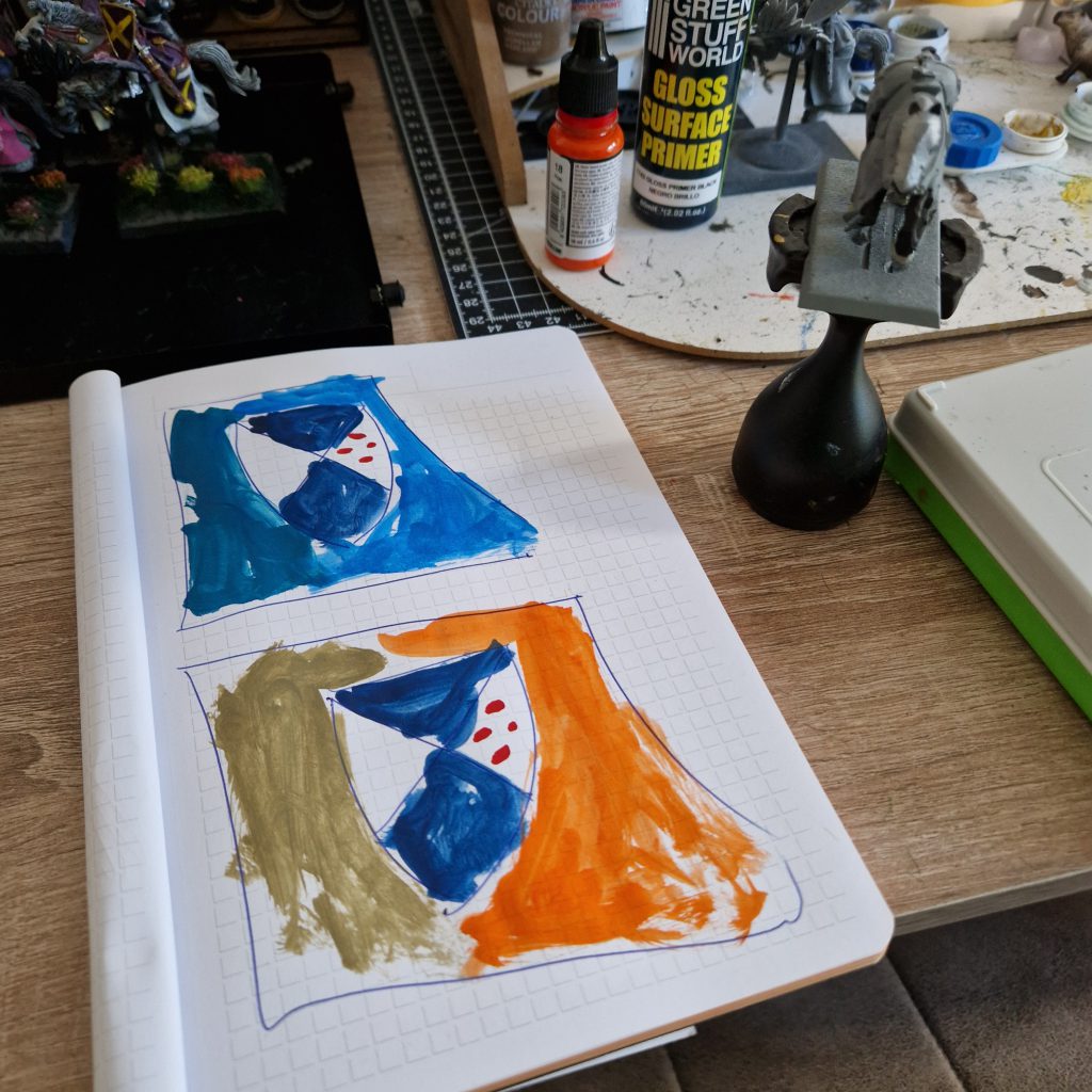 Testing out various barding colours against the chosen heraldry, the old-school way - Heraldry (Vallejo 72.920 Imperial Blue, Vallejo 70.918 Ivory): This one is pretty straightforward. Take an HB pencil to draw the field lines you need, then take your time painting them in. The red Southern Cross stars will come later as a decal.