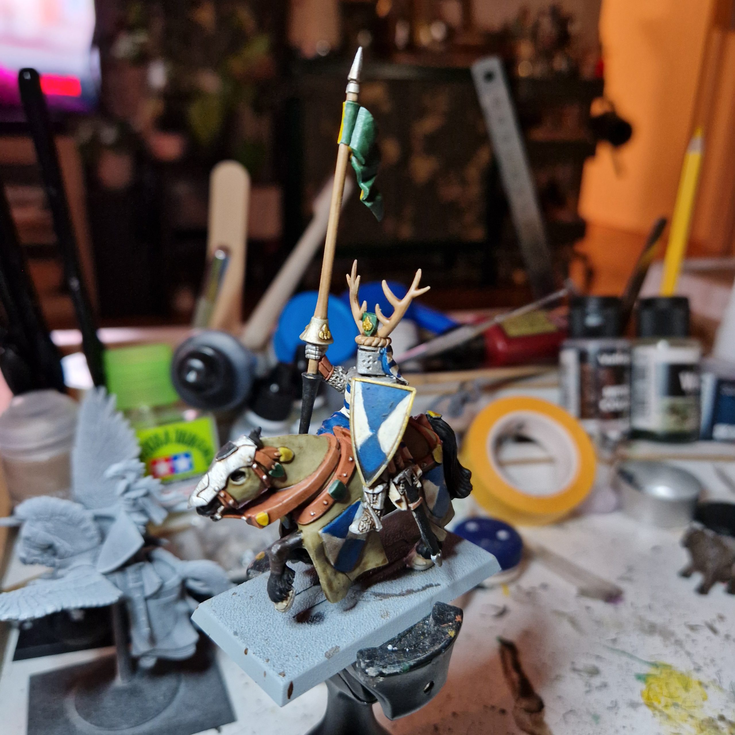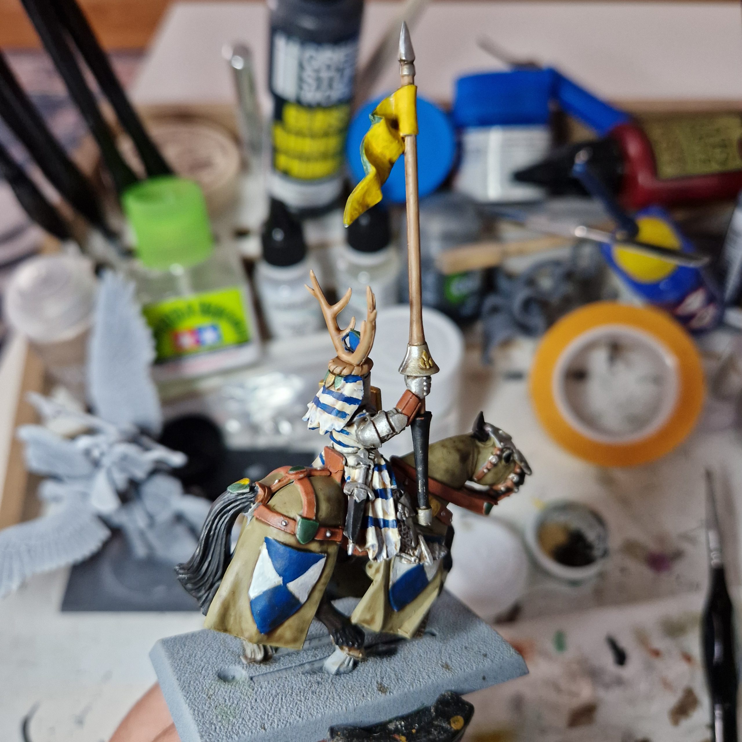 - Personal Touches and Shiny Bits: The pennant gets Baron colours (Army Painter Angel Green, Vallejo 72.006 Sun Yellow), scabbards and lance haft is black (Vallejo 70.950 Black) and I use Army Painter Mithril, Army Painter Bright Gold, and Army Painter True Brass for metallic parts.