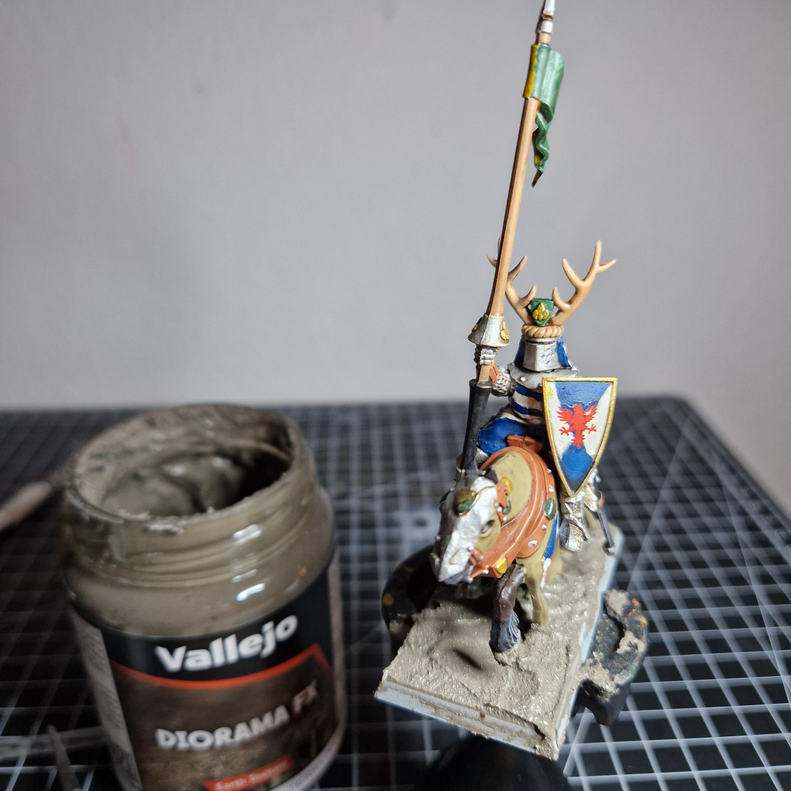 shortscloth bits at the bottom. The cloth behind the helmet gets the same treatment too. Then of course, there's the shield. - Wooden Components (Vallejo 70.843 Cork Brown): Knights of the Realm are relatively 'horde' so I've taken a bit of liberty to use the same colours for components. In this case, the lance shaft, the rope-looking thing on the helmet, the stag horns all share the same colour. I've also painted the back of the shield with this colour