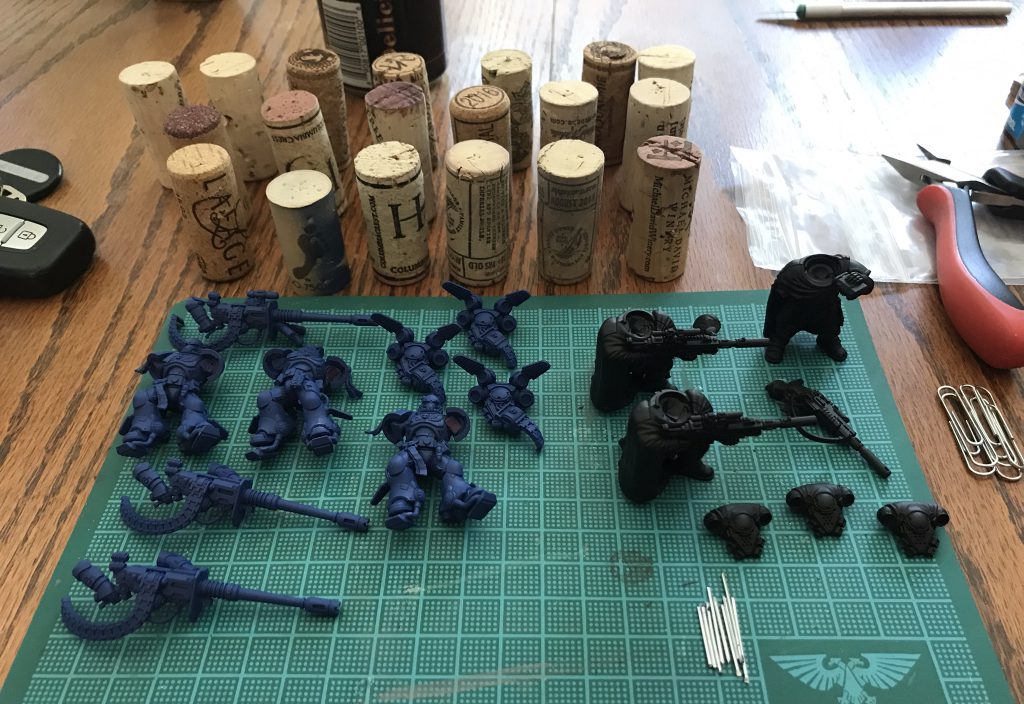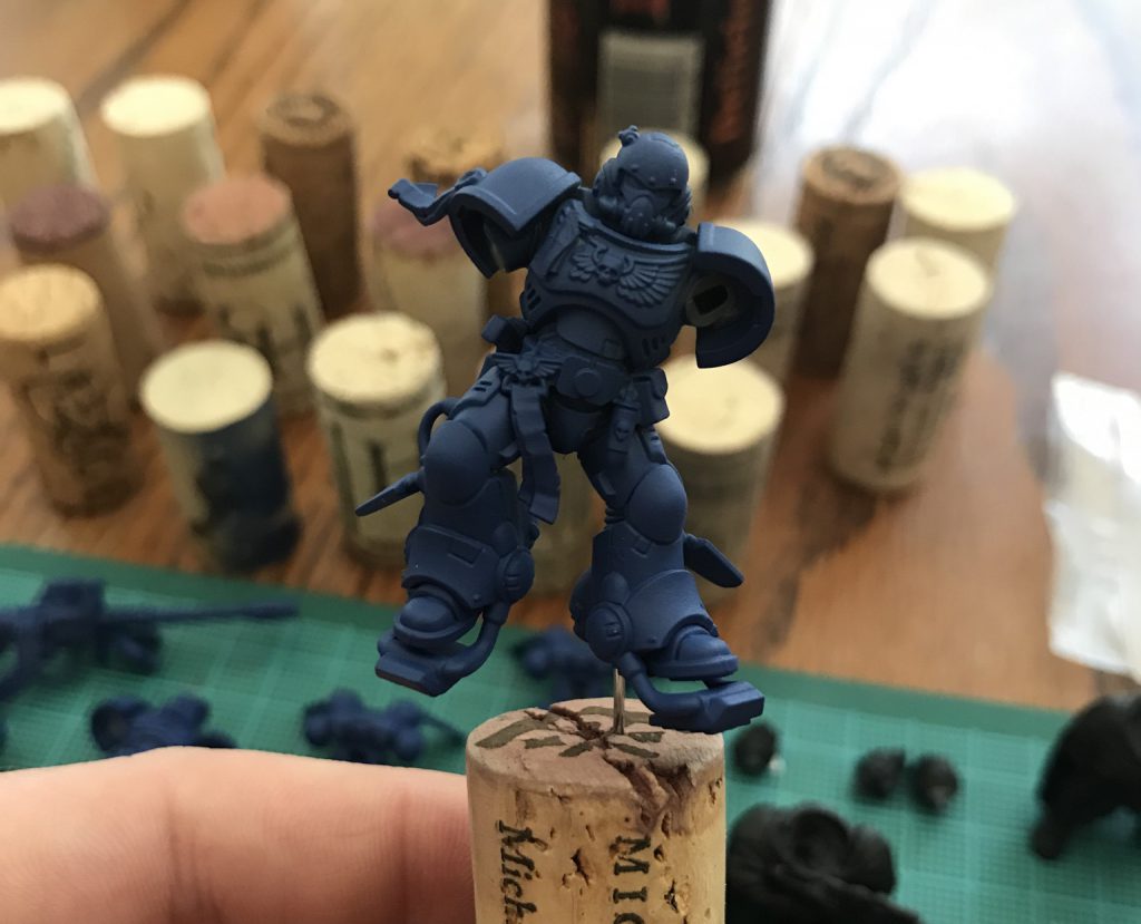 C. Pinning (keeping your dirty nerd hands from ruining your work): For this you want some paperclips and wine corks. What you then do is drill a VERY SHALLOW hole into a non-visible part of the model like the bottom of a foot, gun barrel, or connection point and then use a small amount of super glue to attach a clipped piece of paper clip to it. You then suspend the assembly upwards by push the other end of the paper clip into the cork.