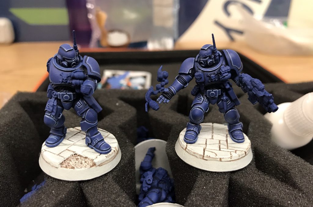 I went with a black-to-white zenithal highlight for the pair. I wanted the maximize the contrast between the armor shadowed by the cape and the bright blue of their exposed pauldrons and helmets.Step 2: Basecoating