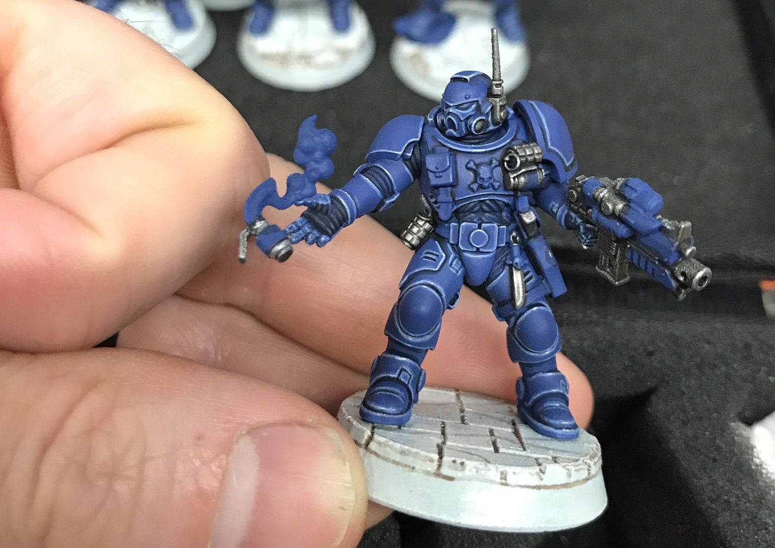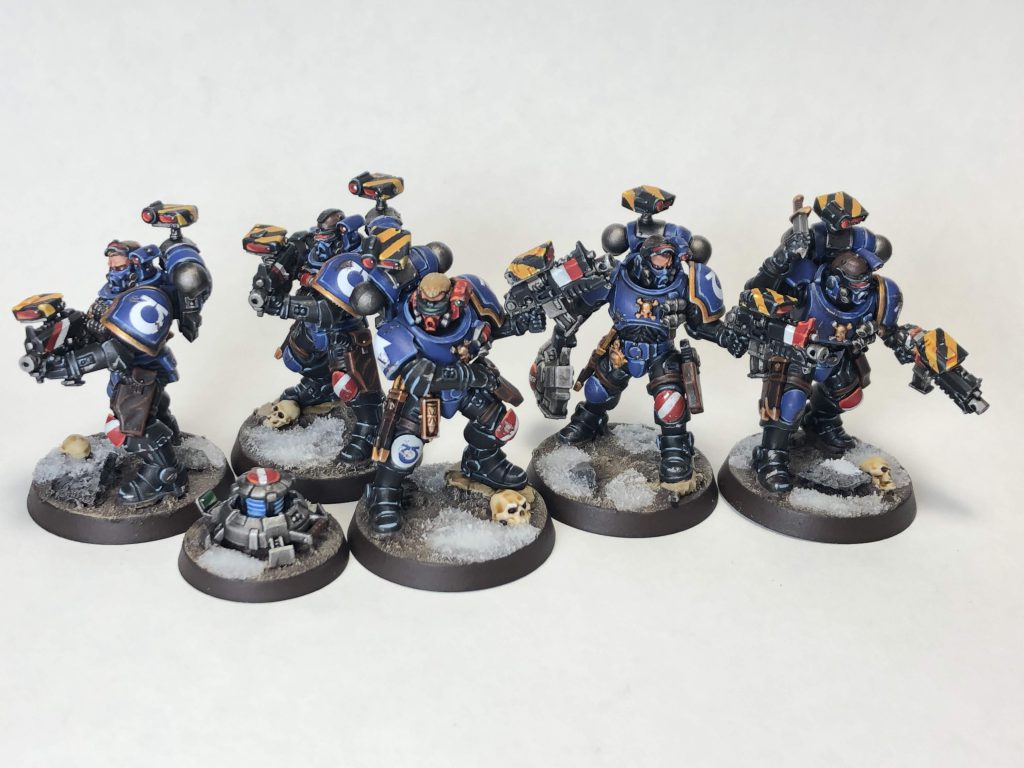 Ultramarines Incursors. Credit: SRMWhile this doesn’t appear on these models, black armor is a feature on Chaplains and I like to paint black elements on my Phobos models. For this I go for a different, cooler black, using the same final highlight color to better tie it in with the blue armor.