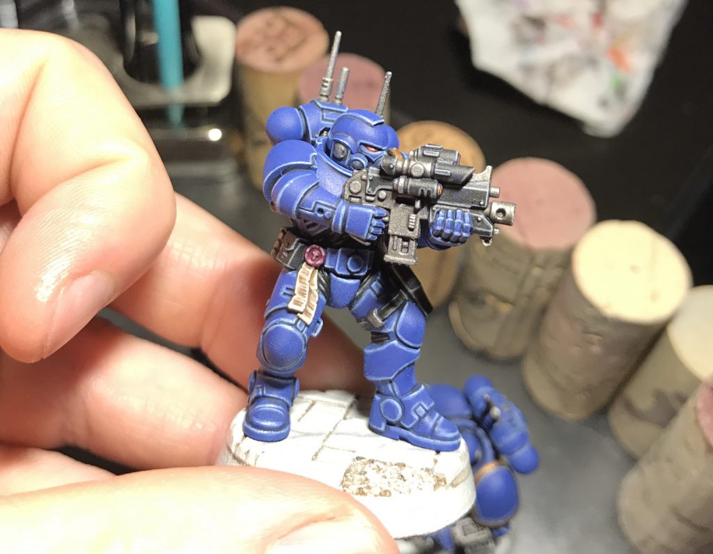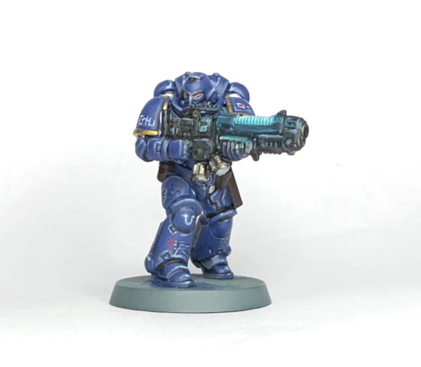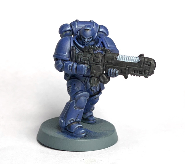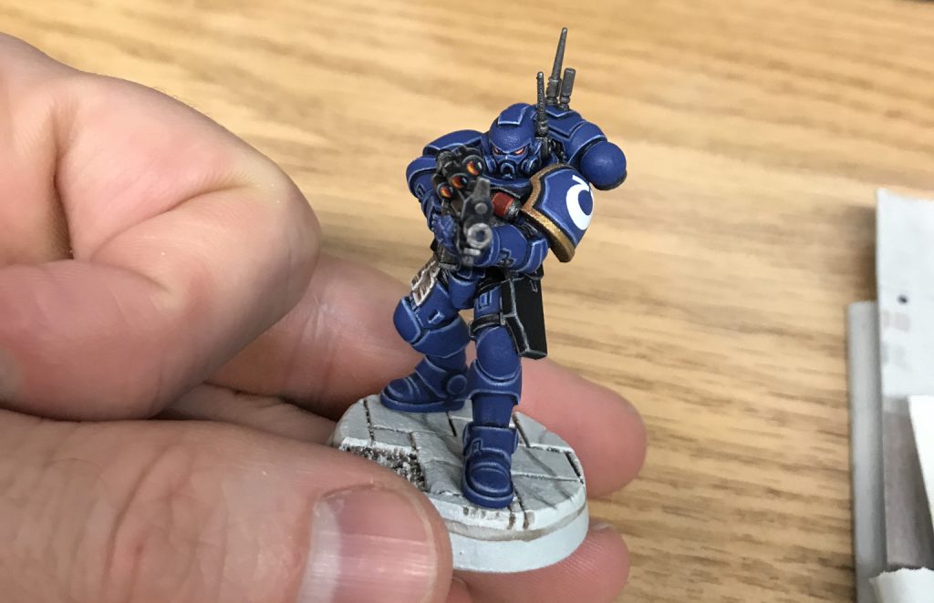 No self-respecting Ultramarine would go to war without the proper iconography. My technique is identical to JD’s. However, we have one more step to go!Step 13. Weathering