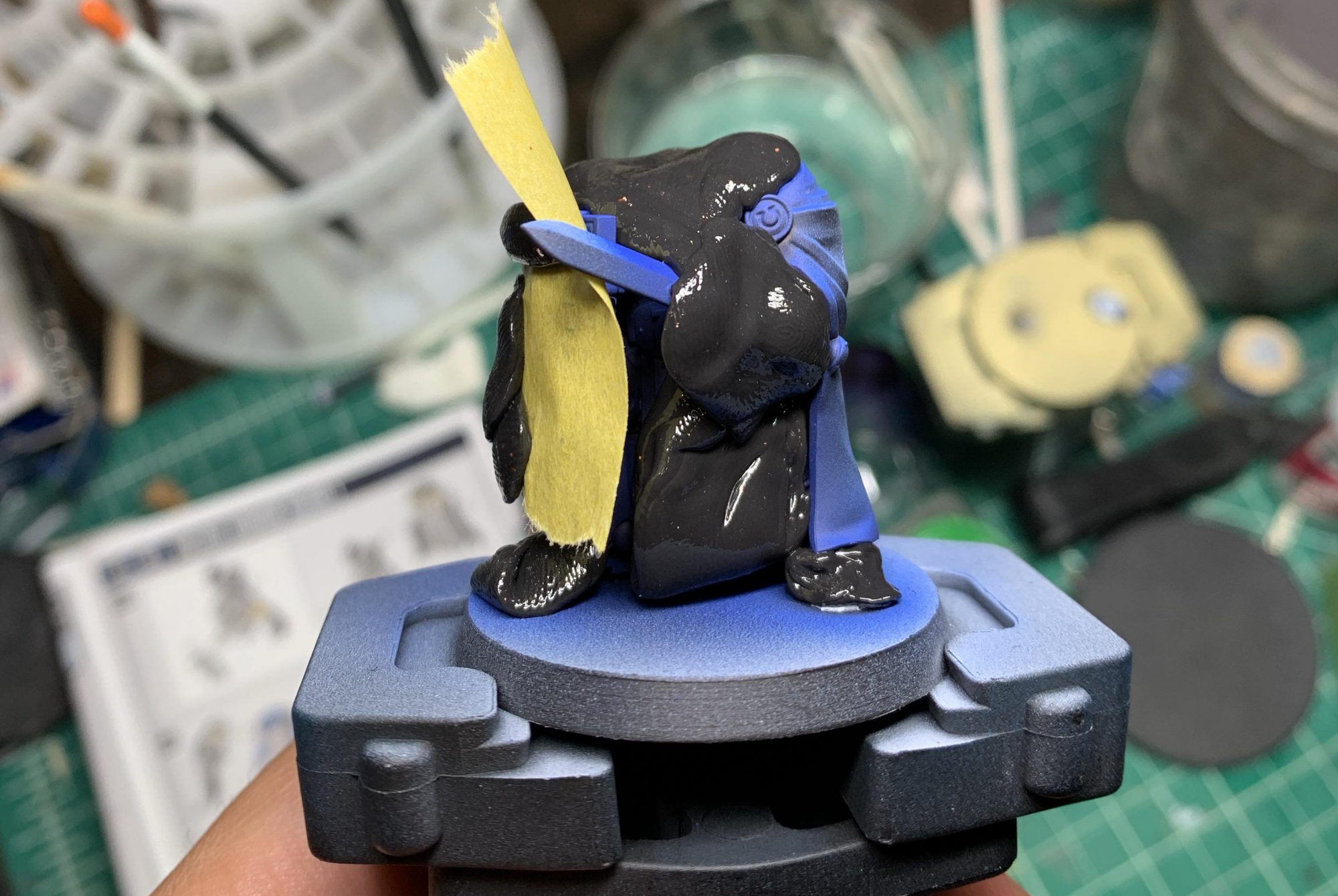 Take some Nuln Oil and mix it with Contrast Medium, mix it about 1:2 (1 part Nuln to 2 parts Contrast Medium). Now cover all the blue areas. I switched to a different background here for some unknown reason.