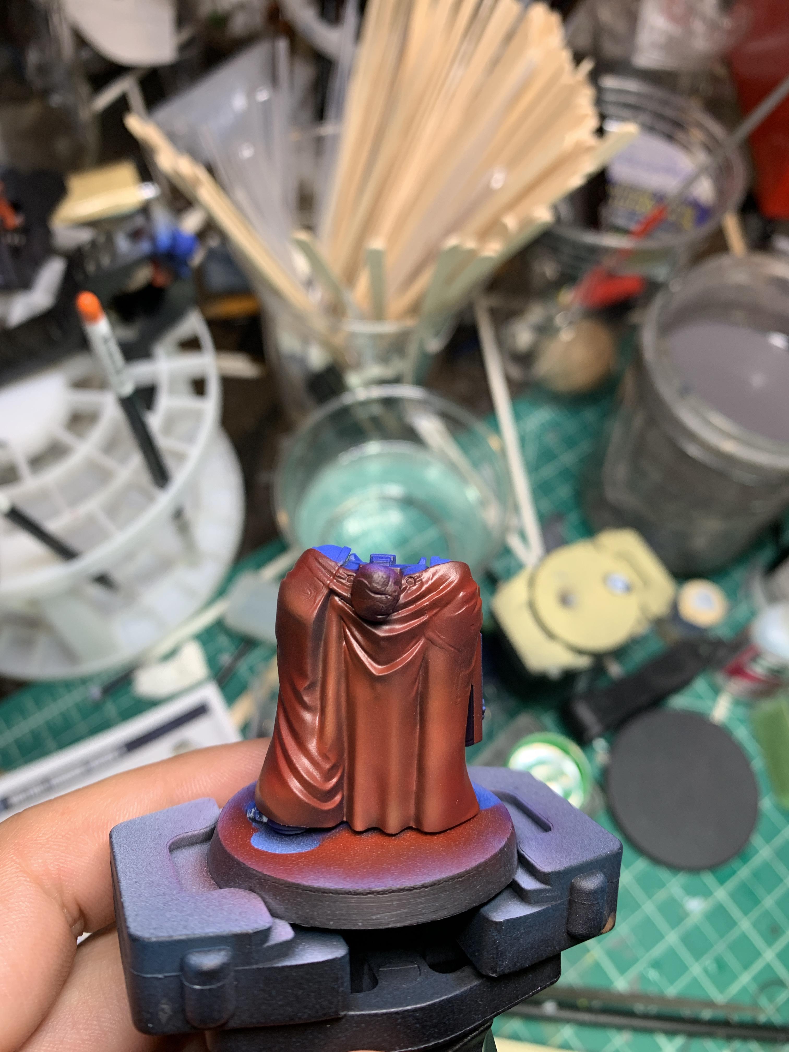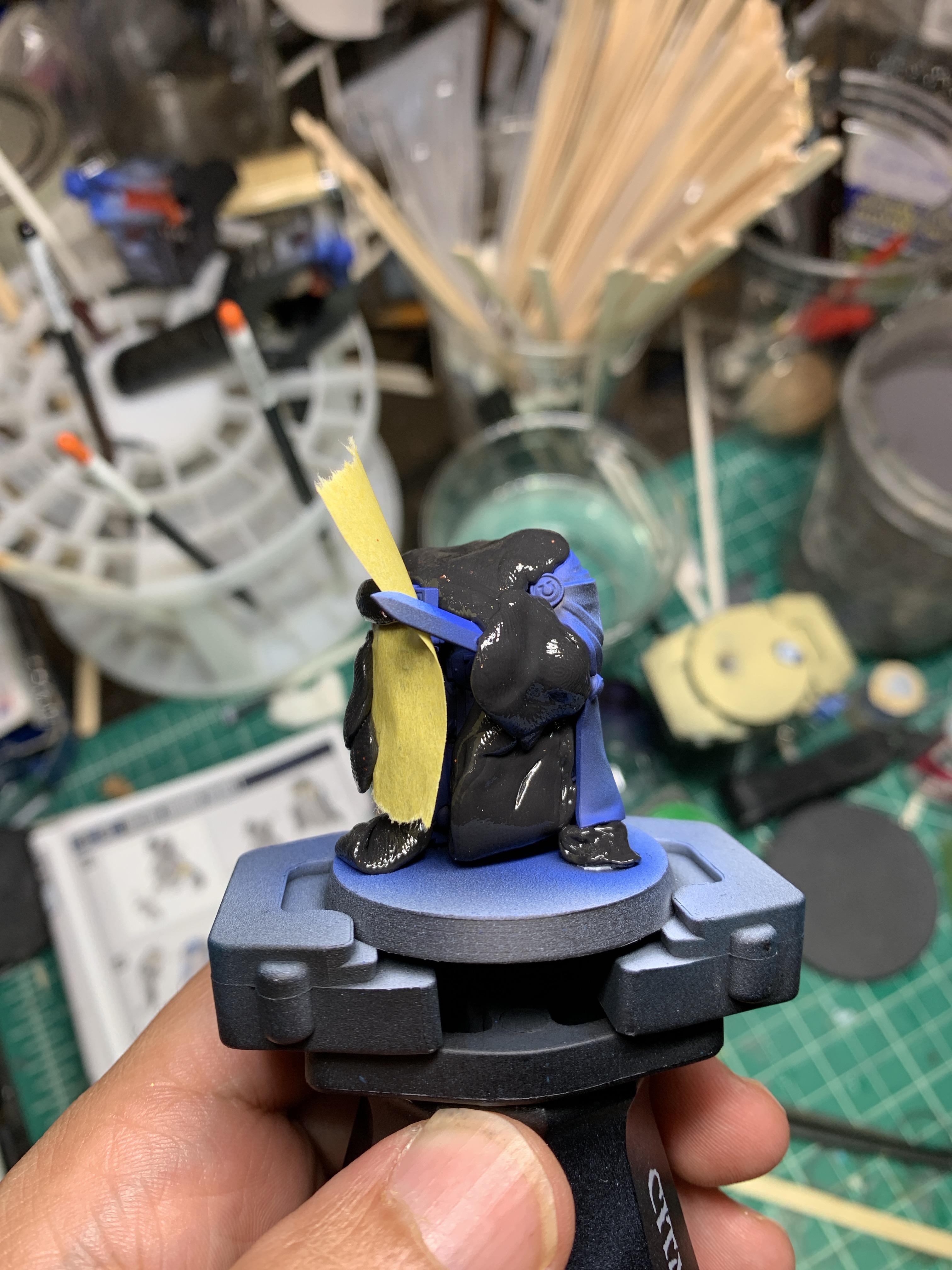 For any project, you want to have a plan! This was particularly the case for these two models because their cloaks were broken up in such a way that I couldn't feasibly paint them in subassemblies without (even uglier) seams when I was done (aside from heads and backpacks). With that in mind, I decided I would spray three main colors, blue for the armor, red for the cloaks, and metal for the swords, in that order and mask in between to protect previous steps.Another important consideration was the inside of the cloaks. I chose not to glue the models to their bases while working on them so that I could pull them off and get at the space between their legs. This is good to keep in mind for any model with a cape or cloak. I did not think of this when I built my first squad of Skitarii and it was... not fun.