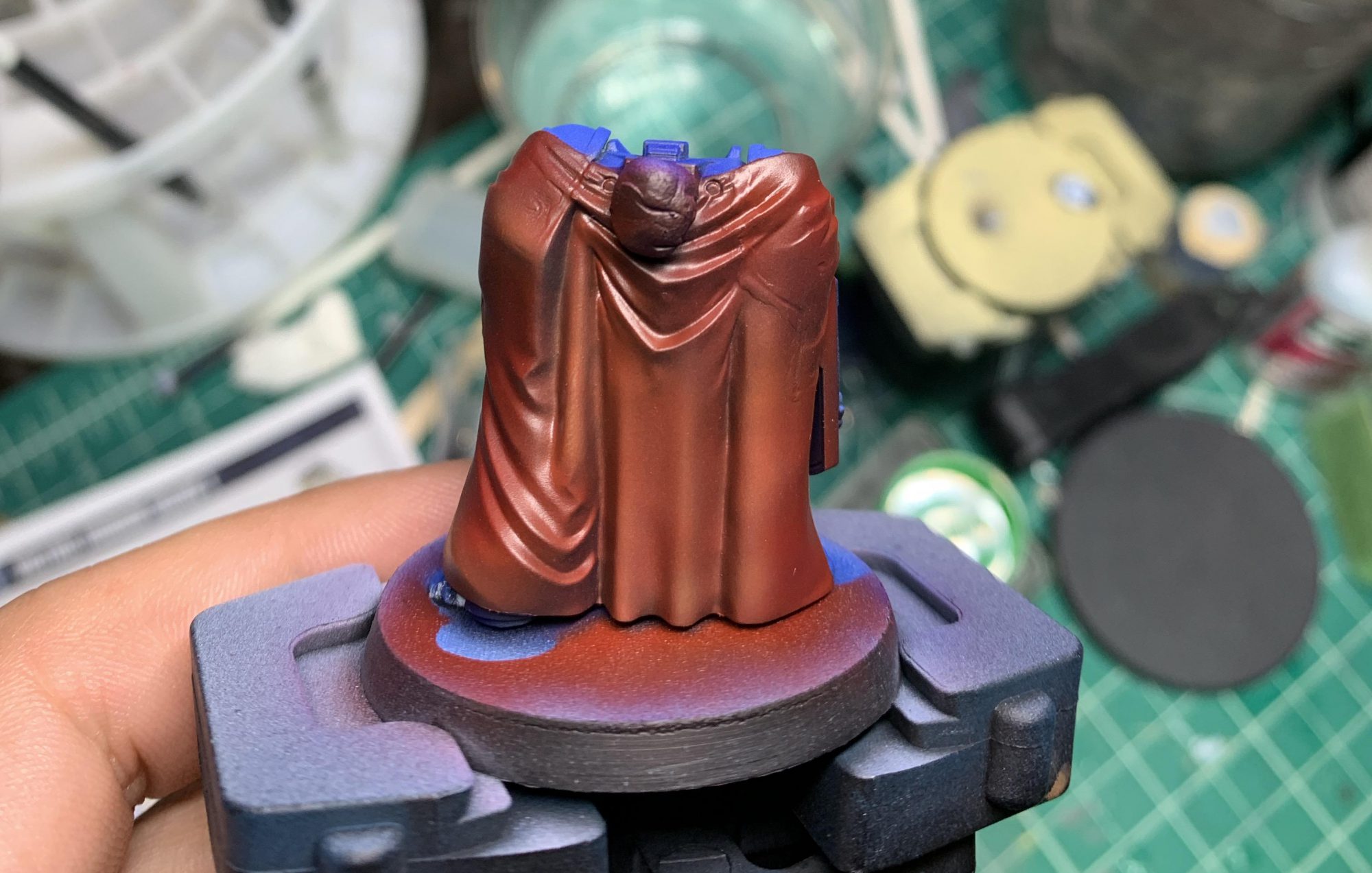 Washing was pretty simple. A pin wash of a black/burnt umber mixture (giving me a warm black to contrast with the cool blue) on the armor and deepest shadows of the cloak and all-over washes of burnt umber on the gold and other details. The interior of the cloak got an all over wash which I ten cleaned up with some white spirits.