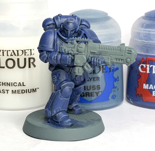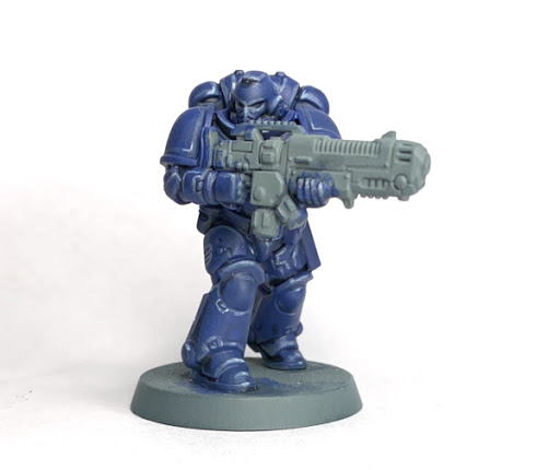 After priming the model grey, cover it in thinned Macragge Blue (it took 2 quick passes with a size 3 brush to get an even coverage)