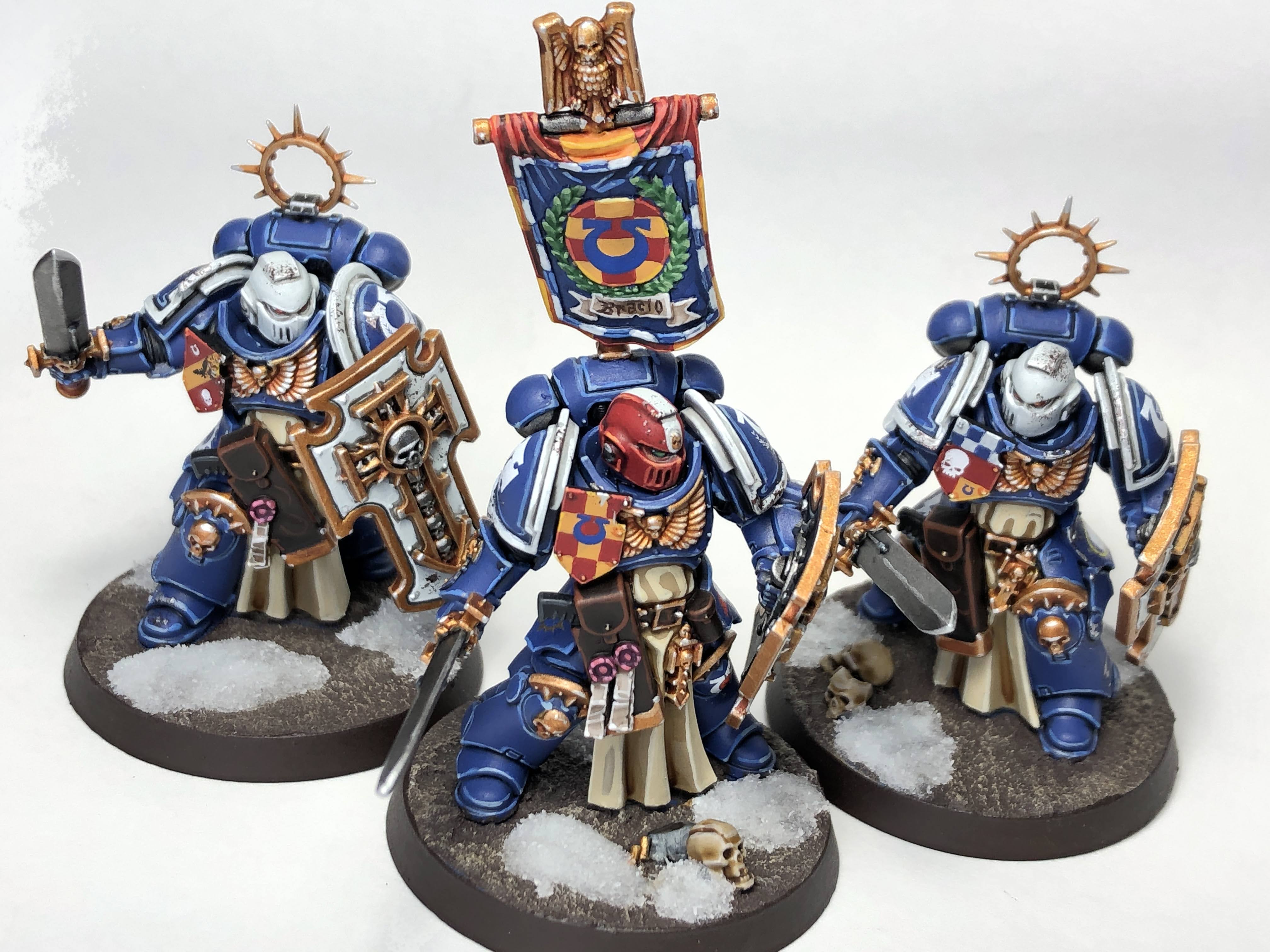 Ultramarines are THE codex Chapter and as such they follow all the heraldic conventions laid down by Roboute himself. This makes for a lot of fun opportunities for little details and visual interest, such as distinguishing a squad of veterans with white helmets, or picking out a specific sergeant as a veteran with a red helmet and white stripe, or individual squad markings, etc. The adherence to codex markings is actually one of my favorite things about the Chapter because it adds some visual variety and also helps you tell micro-stories as you paint your squads and models. Ultramarines are vaguely Greco-Roman, and as such you can also make good use of certain motifs like laurels or helmet crests to help set models or units apart.