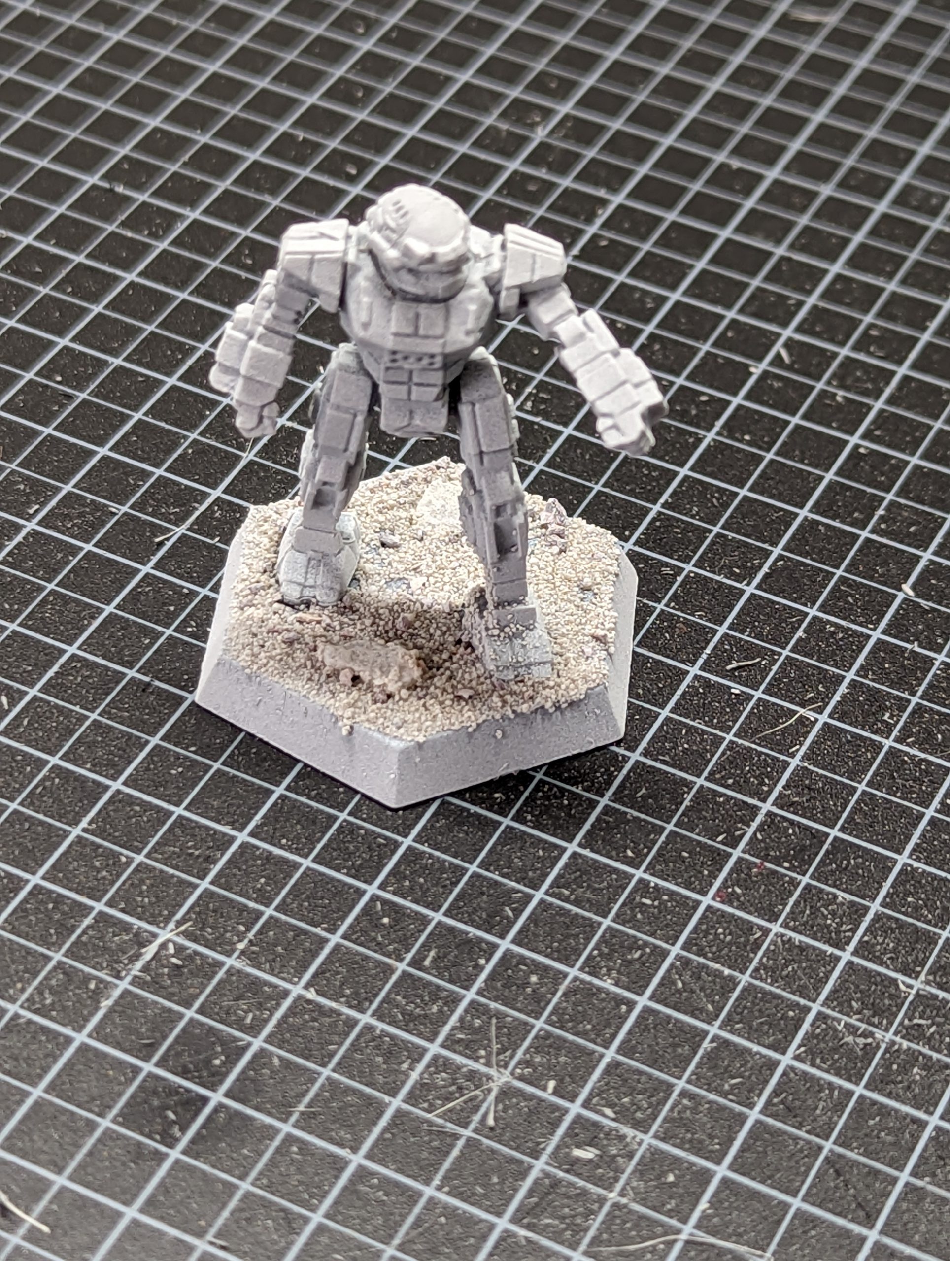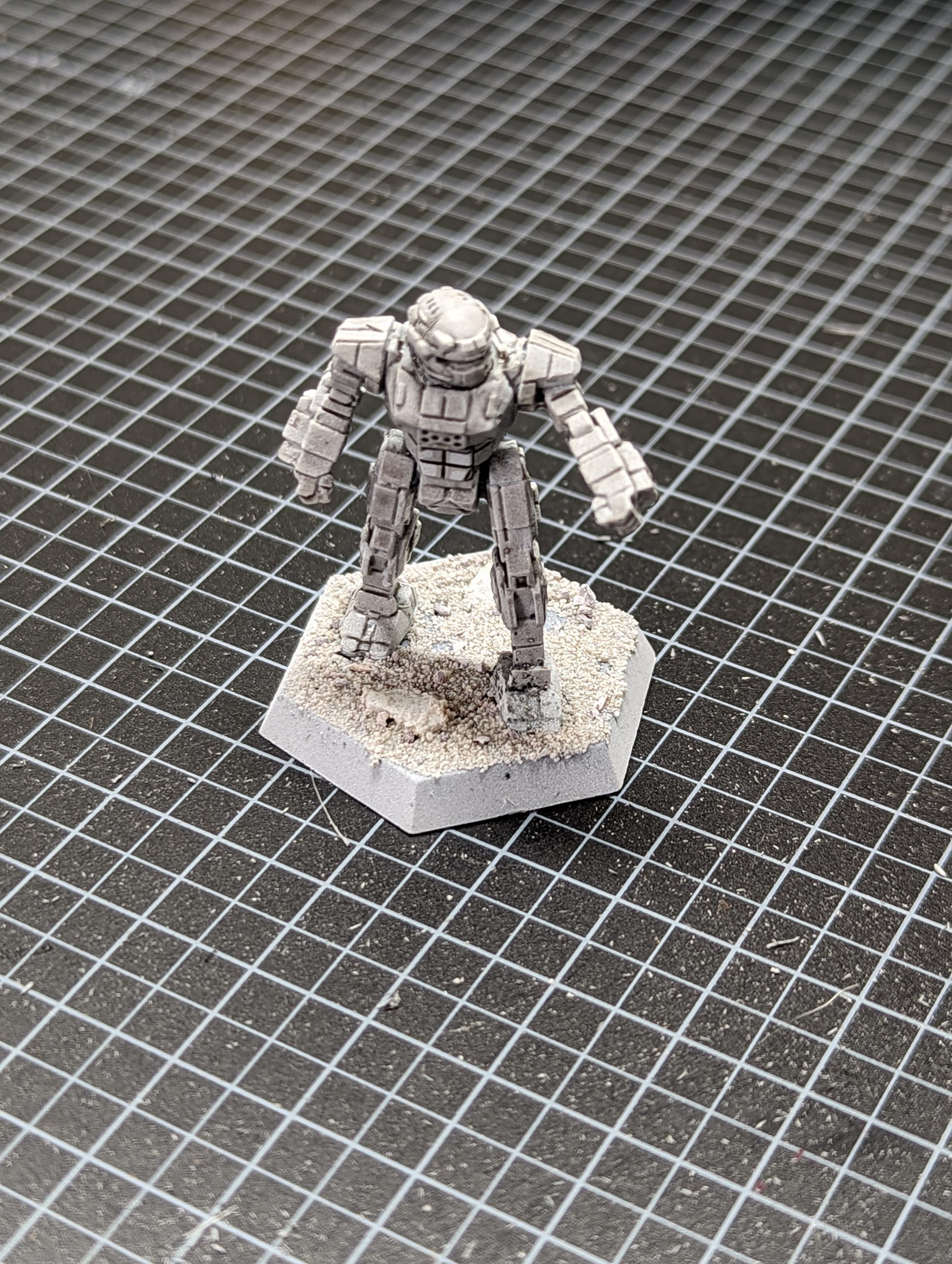 For this I've taken a model with a lot of surface detail, a Battletech Commando mech. I've based this and sprayed it with White Scar primer.