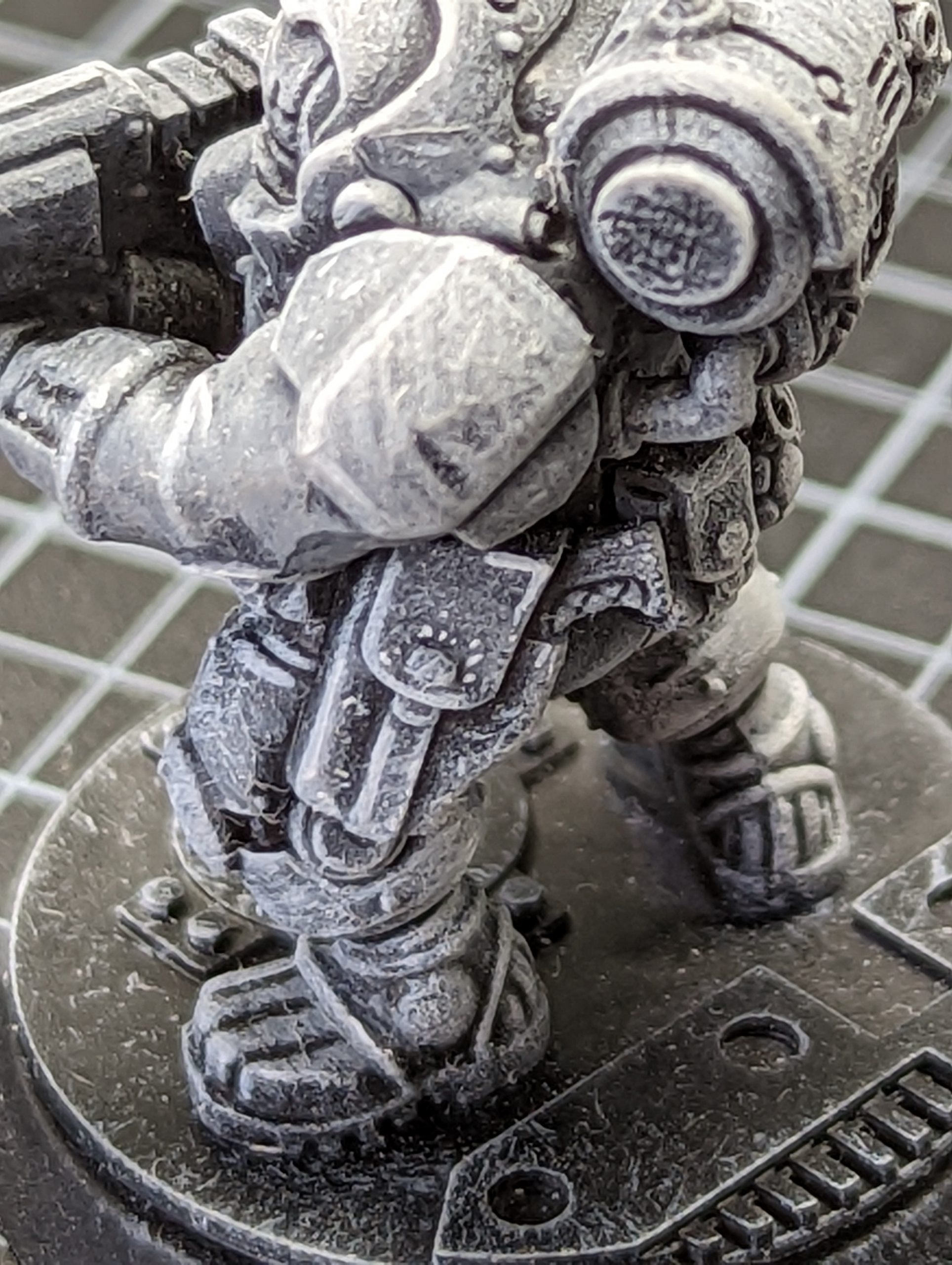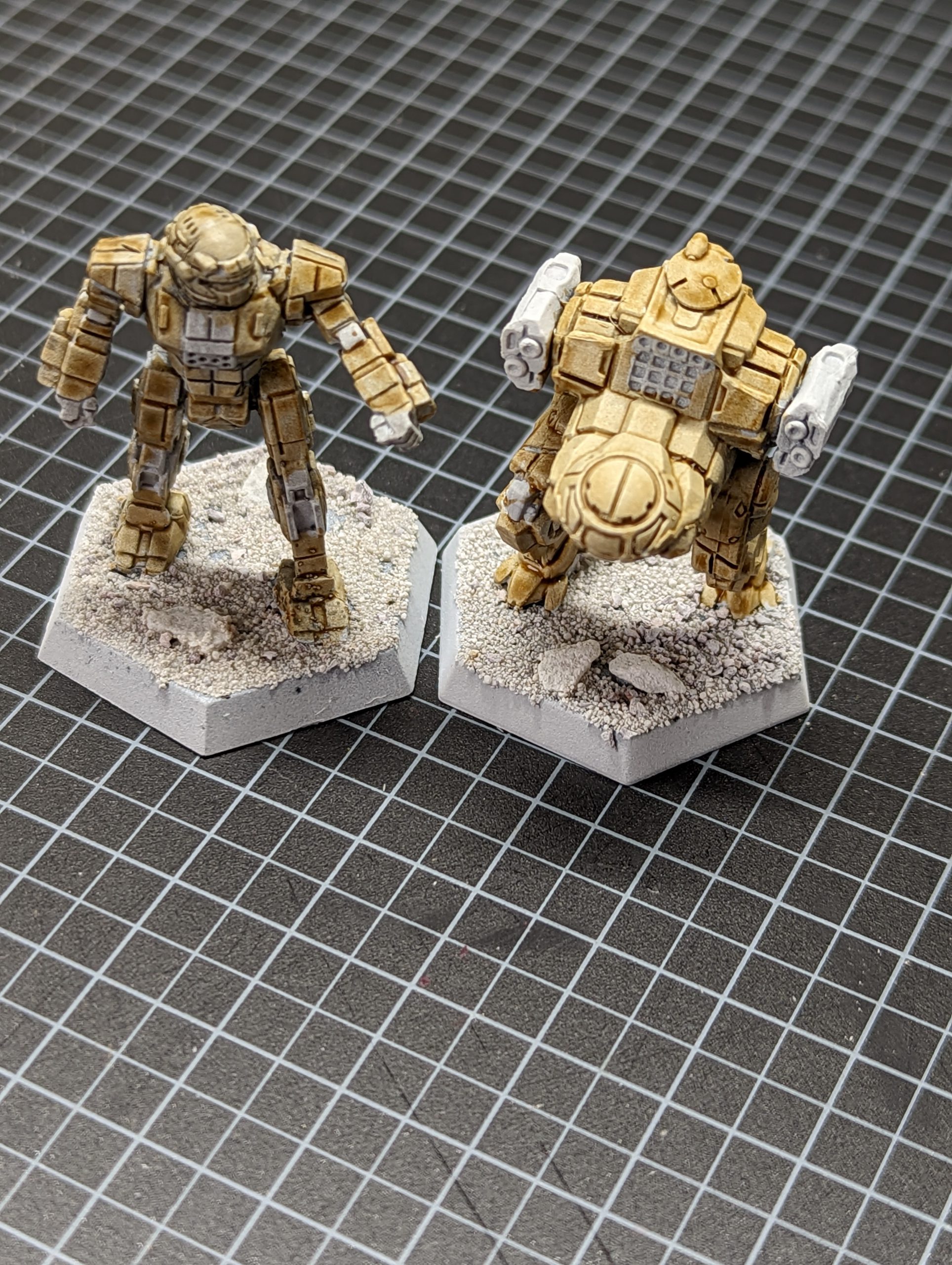 Commando mech with Imprimatura vs Jenner without Imprimatura - with one coat of Contrast Skeleton Horde.As you can see above the Commando with the Imprimatura has a darker tone, especially in the recess details. In painting both miniatures I found the Commando easier, as the recesses had already been darkened by the Nuln Oil and I could concentrate on the surfaces. The detail was already clear, and I could concentrate on getting the effect on the armour plates with the Skeleton Horde that I wanted. On the Jenner I found myself going over it, pushing Skeleton Horde into the recesses in order to get the lining effect that was already present on the Commando and even then it looks flatter.