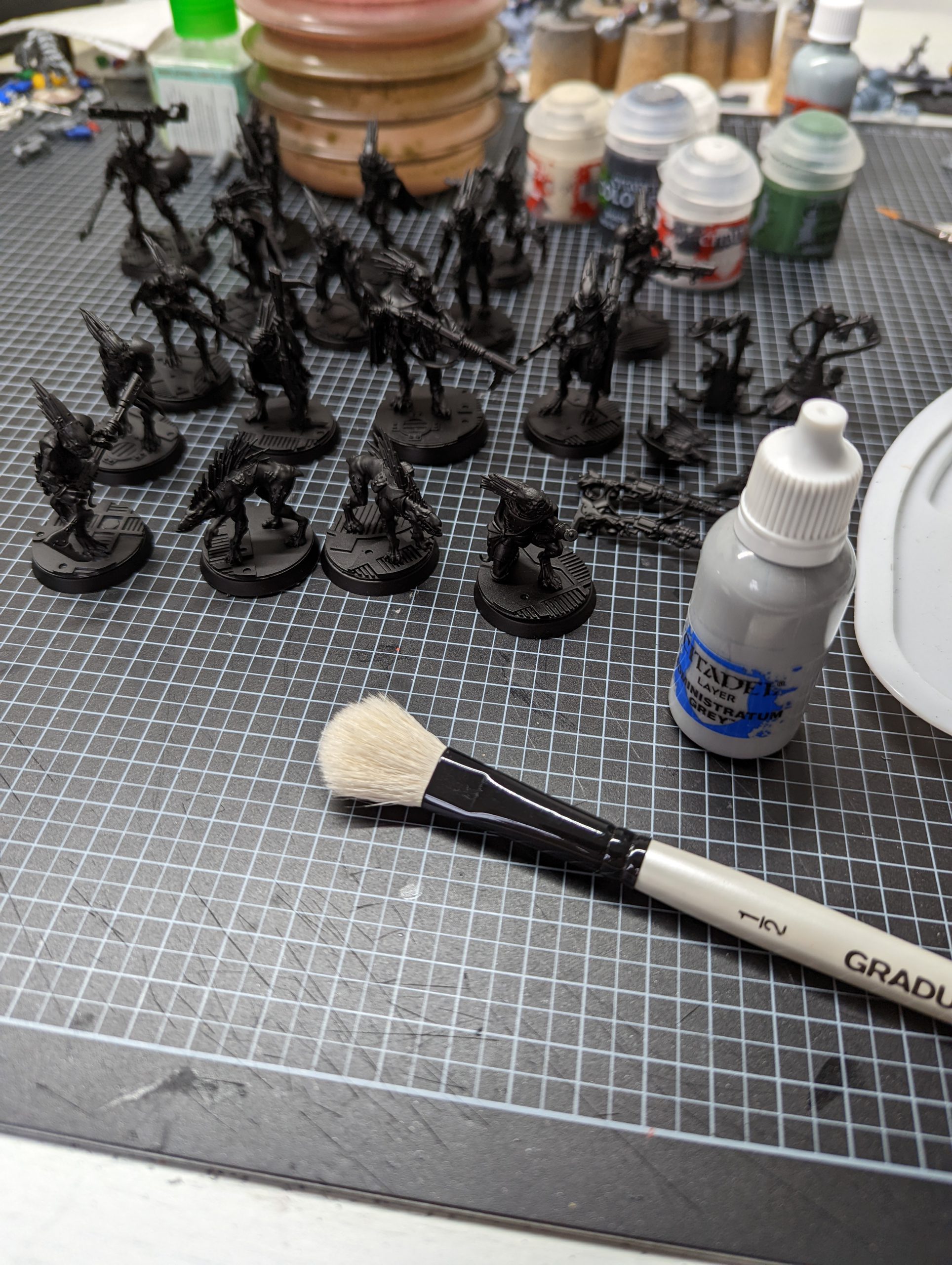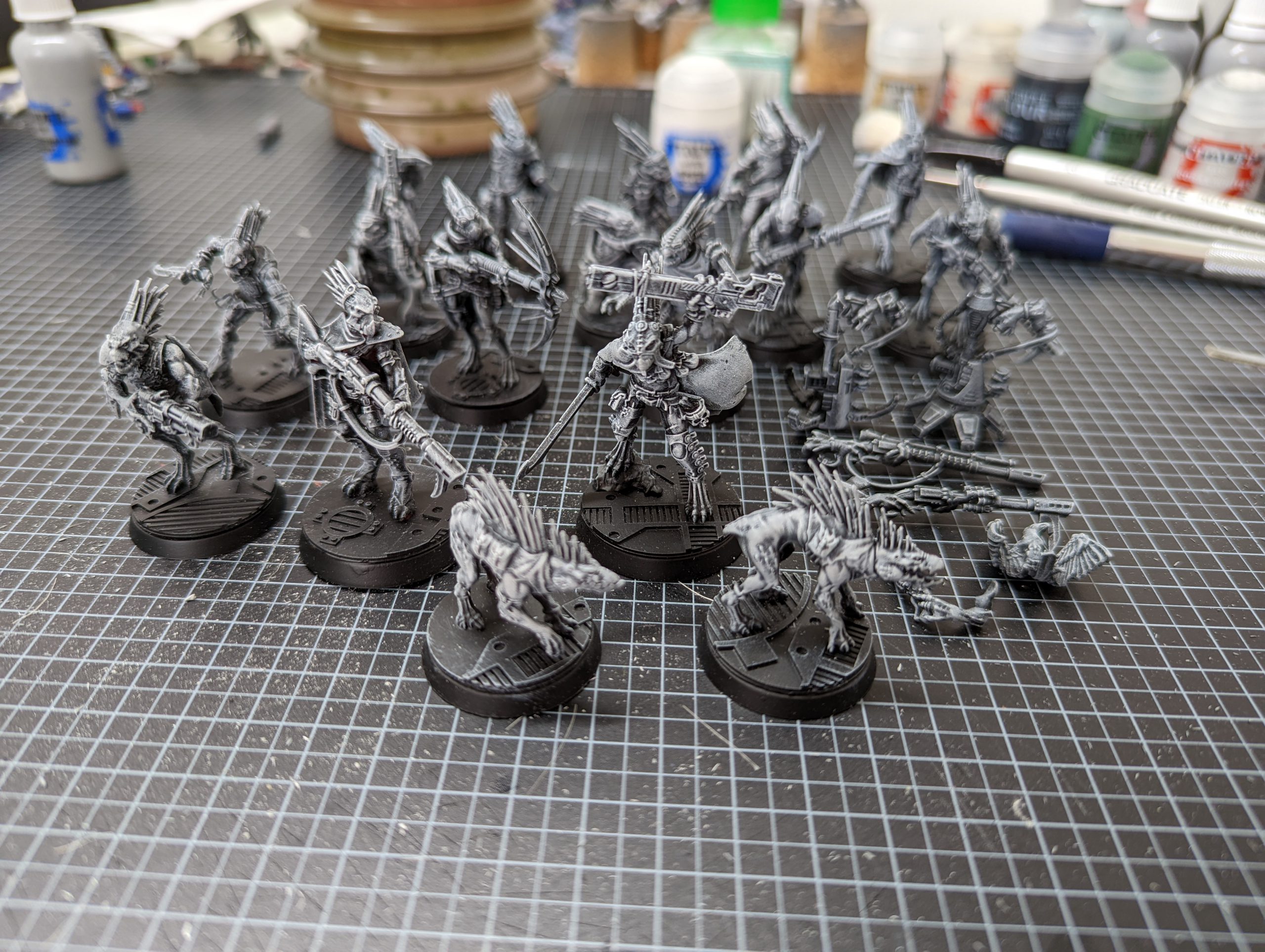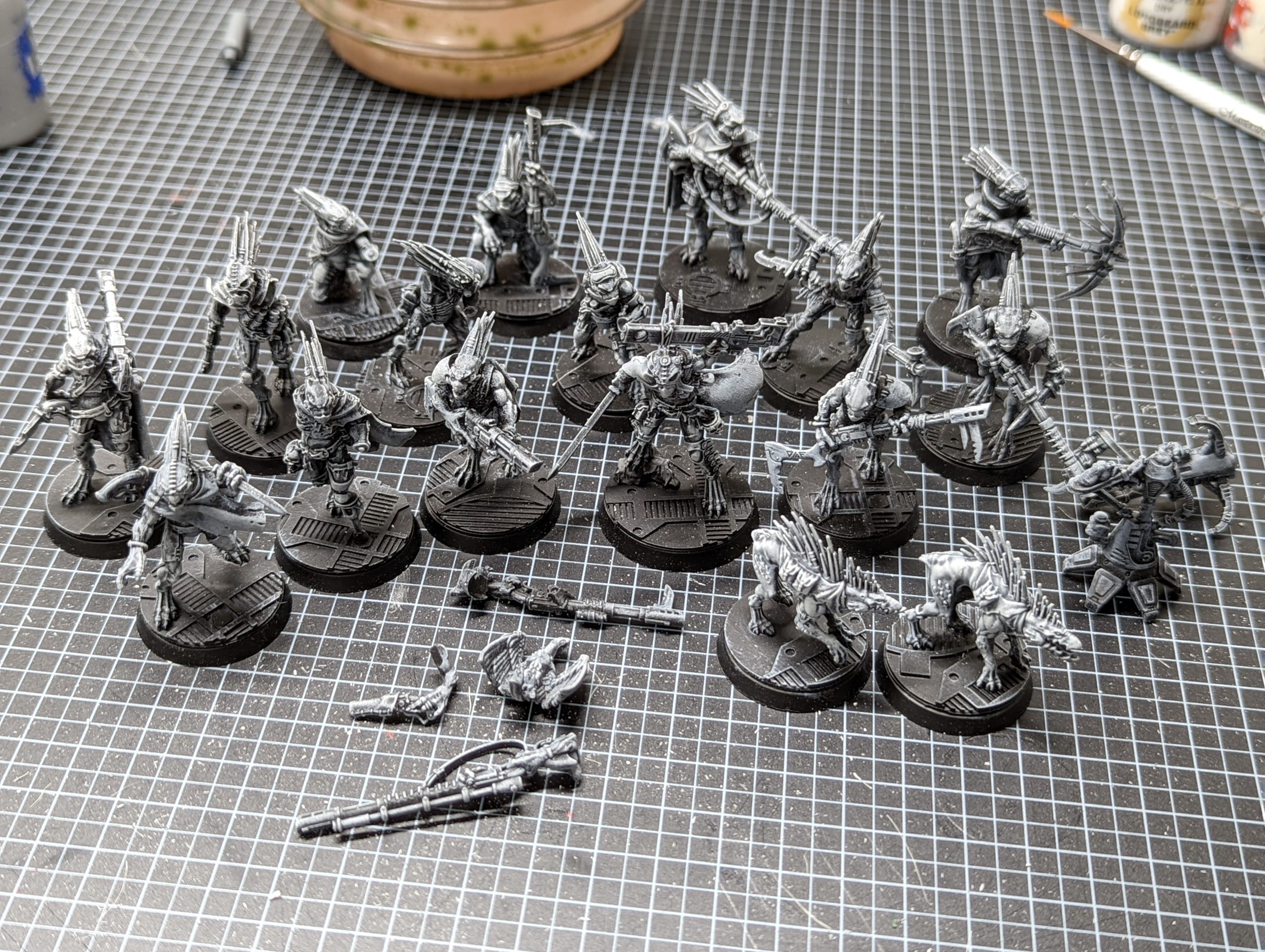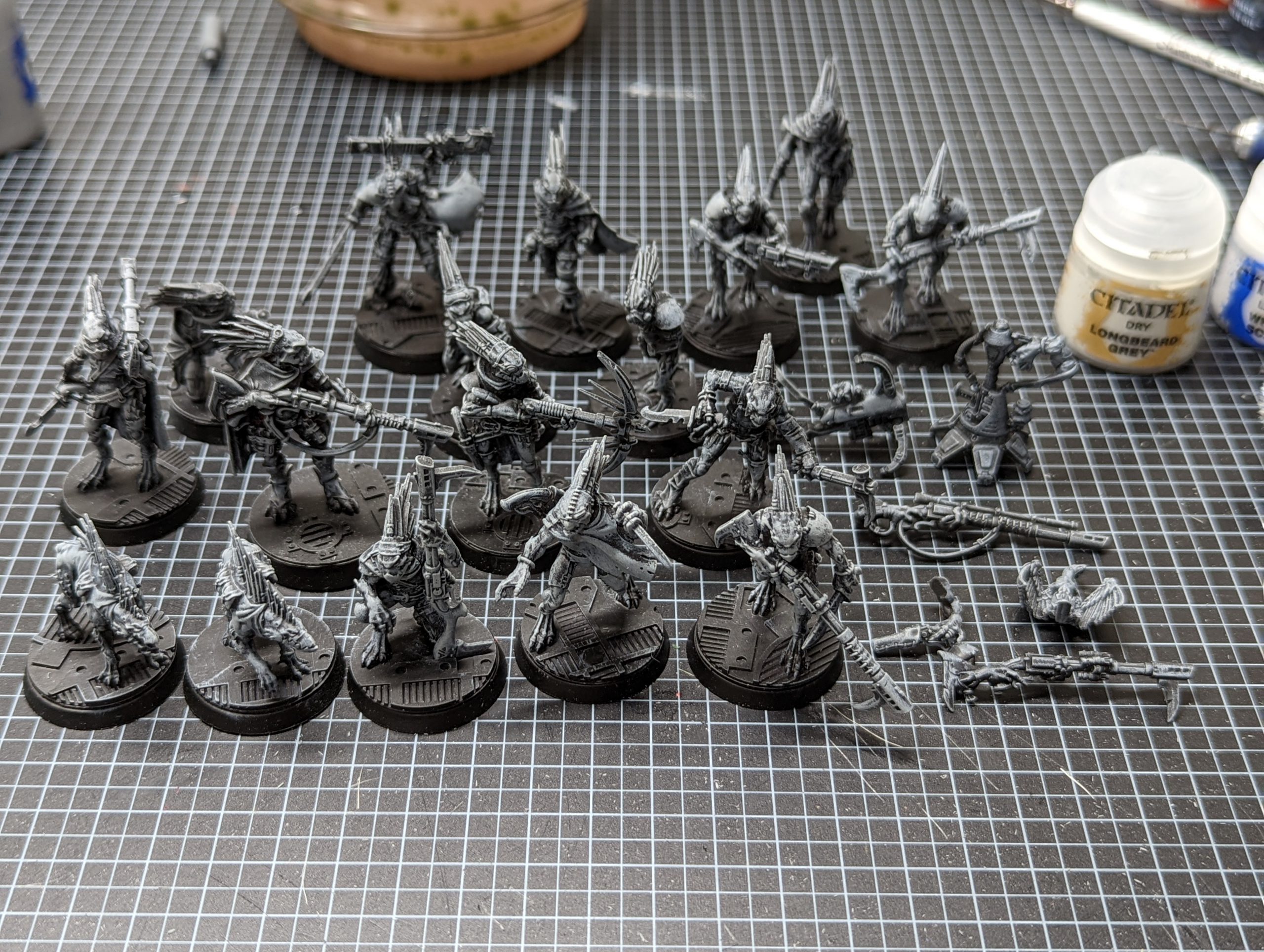 Kroot Kill Team roster assembled and sprayed - ThundercloudAs you can see that's a lot of little Kroot. I started with Administratum Grey and a large soft drybrush.