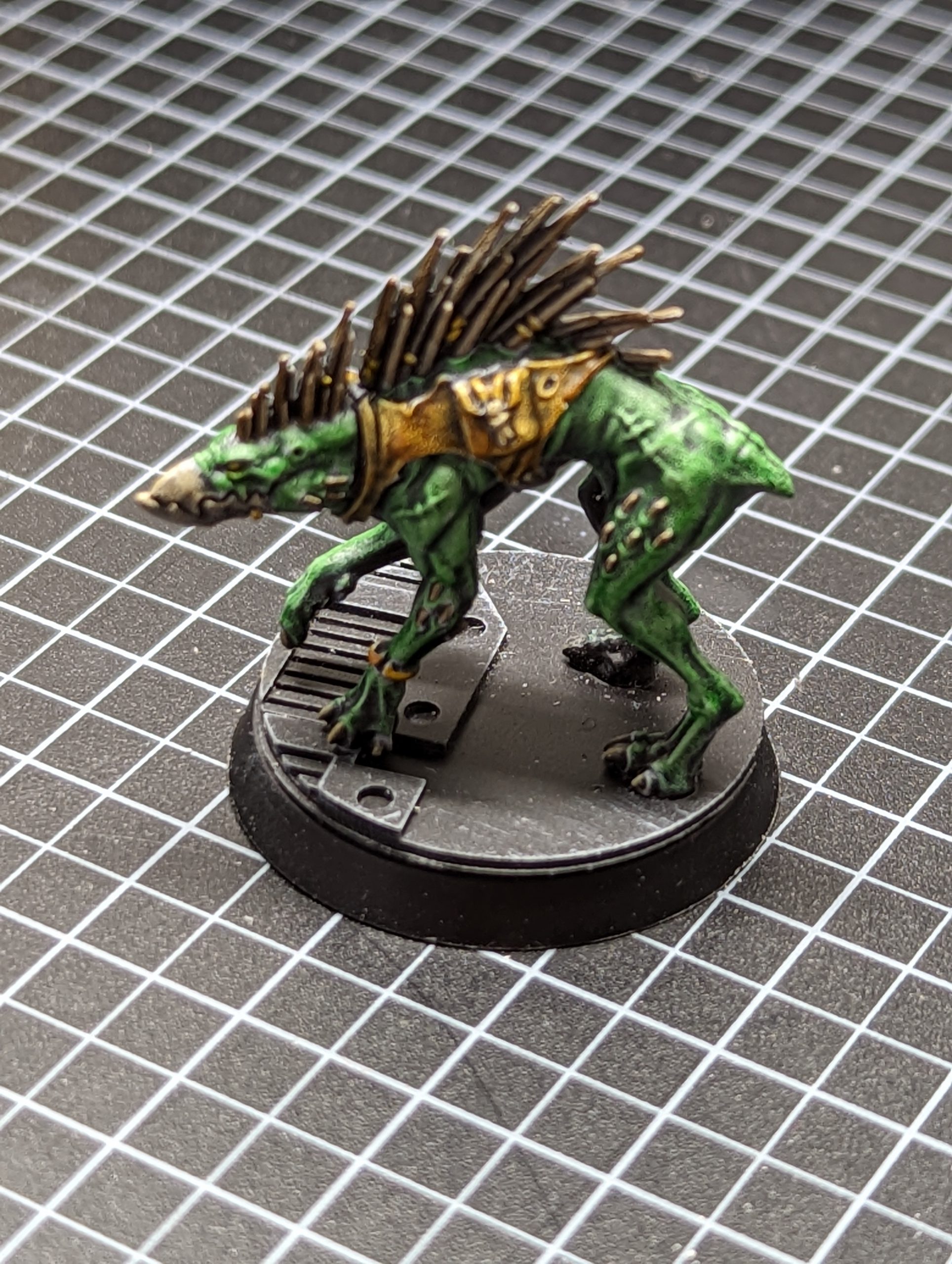 As you can see this is now a tabletop standard model and the only thing needed before popping it on a table is the base being done. I'll go back for a few details to punch up the model a little, but in a couple of sessions (doing the grisaille on the whole kill team and coming back and spending ten minutes on a Kroot hound) I now have a serviceable model, which is what I wanted.