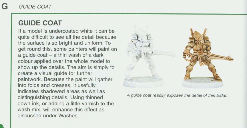 A thin wash applied, often of burnt sienna or burnt umber applied on white (so Agrax Earthshade, heavily thinned down brown contrast, etc can be used to duplicate this in miniatures). On a flat this will give a tone that can make it easier to judge value and colour, but on a 3D object like a miniature this will essentially preshade the model in the tone used. You might use blue for a miniature where you want cold colour values, orange or brown for warm, even red, yellow or black. This is a matter entirely of your preference as a painter. On a 3D object this will line the detail (rather like panel lining) and help you pick out the differences between the various textures on a model. Ideally the thin wash is thin enough that it doesn’t leave much on the flat surfaces but hits the detail.If you read the ‘How to Paint Citadel Miniatures’ book from Games Workshop which came out relatively recently (ok checking that 2003 I’m like that guy out of Indiana Jones) then on page 38 this technique is referred to as a Guide Coat.