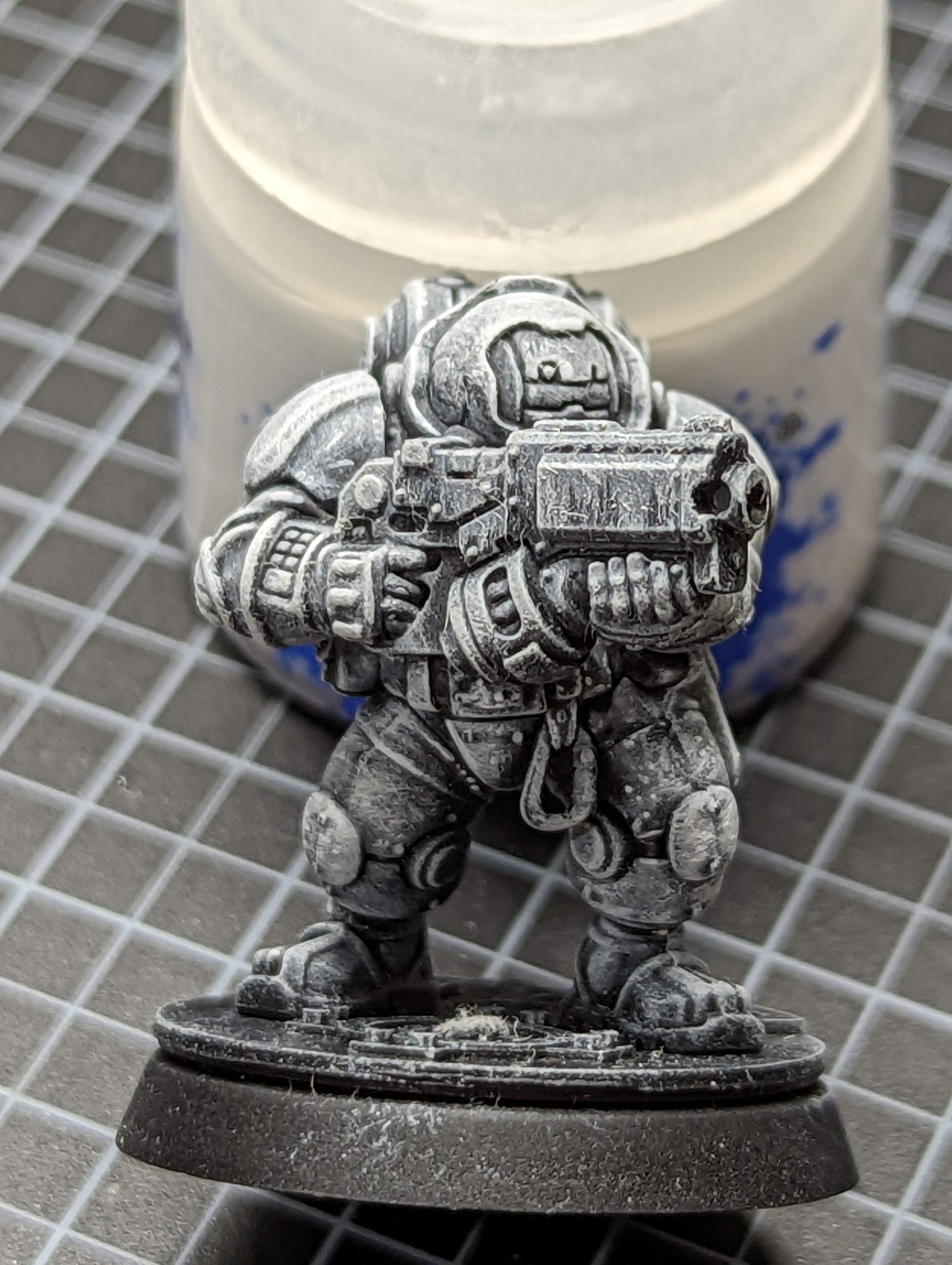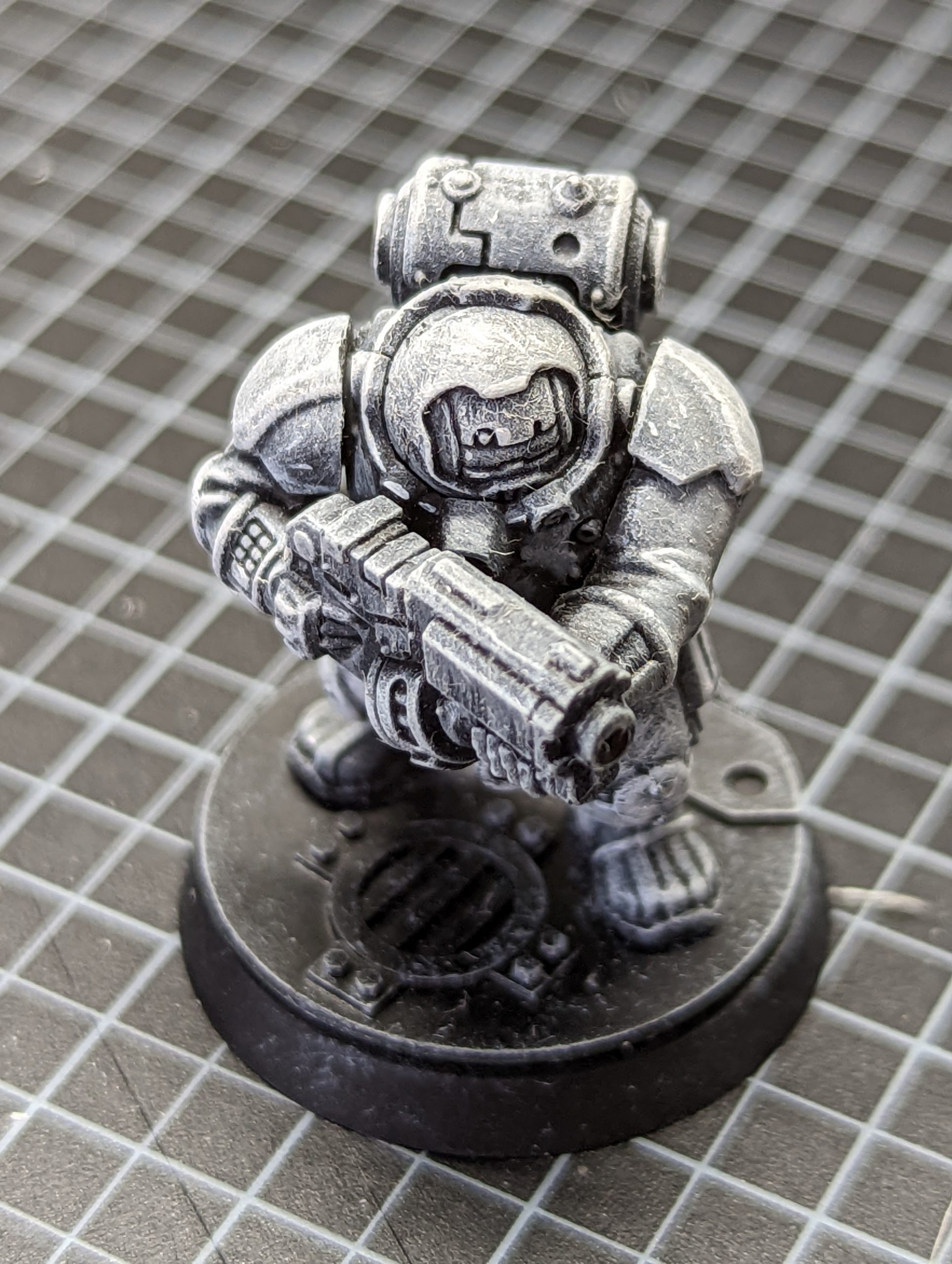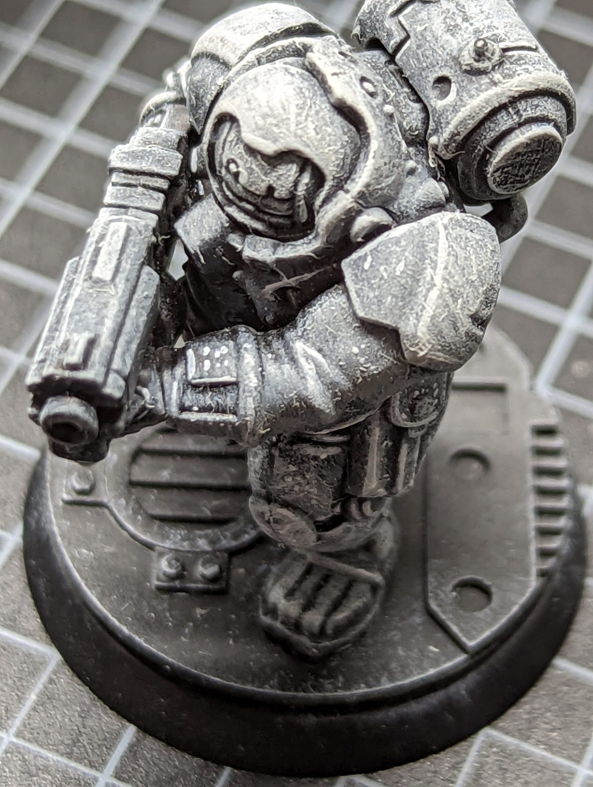 Grisaille with Administratum Grey, Longbeard Grey and White Scar drybrush as before.With a grisaille, you build the highlights in, and you can take a fairly small brush and your pot of White Scar, and look at what you want to detail. Particularly good things to try is wear on leather, spots/stains on clothing, and scratches/wear on armour.