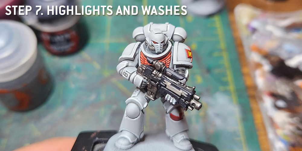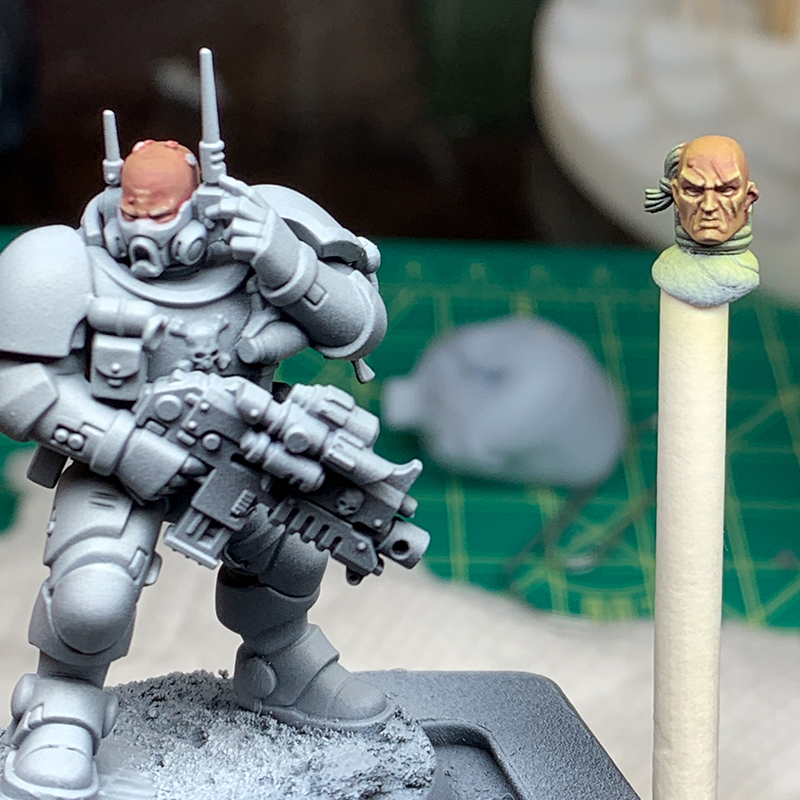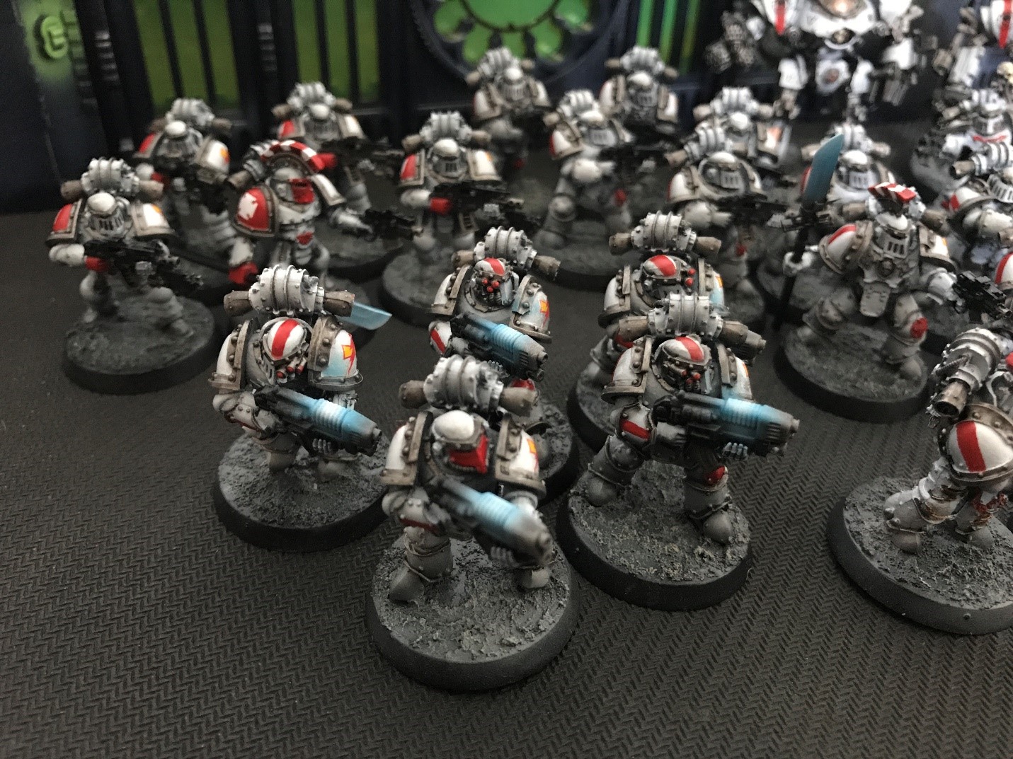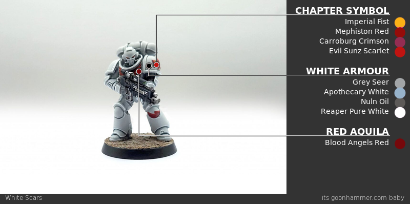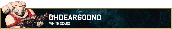 For my White Scars I wanted a large amount of value contrast on the white armor and an earthier looking red to add color. Airbrush is pretty essential to the approach but I hope you'll find it's relatively simple to execute! It's worth saying a few words about painting skin. I wasn't interested in a Caucasian look for these guys so I came up with a skin work-up I liked. Basically the following: And there you have it! OhDearGodNo paints a slightly more traditional and brighter White Scars army, which looks truly fantastic. He does need to clean out his spray booth, though. Painting White Scars can be done many ways, and there are a lot of good resources out there that involve everything from the GW layer method to dipping and now contrast. This method will require an airbrush, so if you don’t have one I’d recommend looking at a different tutorial. Below are the paints I use for an Intercessor. If the model has any brass ammo components showing, I will also use Vallejo Model Color Old Gold 70.878 and wash with Nuln Oil. Vallejo Black Surface Primer 74.602 I also have a Mix of 60% Nuln Oil, 40% Drakenhof Nightshade, which is used for pinwashing (recess shading) the white. I begin with a zenithal highlight using the Vallejo Surface Primer. Zenithal highlighting when priming is to use the lighter color more on areas that would be exposed to the light, and more of the darker primer on shaded or recessed areas. The base coat is VMA White Grey. I found this to be the best looking temperature of white. It’s warmer than a ‘pure’ white, however not so much that it would begin to look more like a bone-ish color. For models that aren’t batch painted or require extra detail, it also gives a little room for edge highlighting. I put on about 2-3 thin coats of the White Grey with an airbrush. You’ll notice with each coat the color temperature gets warmer, by the third coat the actual pigment for this color is apparent. Let all these coats dry completely. I’d say a minimum of 30 minutes should pass between coats, and an hour for the last. After painting the base coat, seal it with a good varnish. I use Vallejo Mecha Matte, as it’s a little thicker and tougher than their standard formula. Do not skip this step. If you don’t seal the white, the minute you so much as breathe on the mini the paint will speckle and peel off. Make sure to cover the entire model. I let the varnish dry overnight before moving on to pinwashing. Now begins the most daunting, frustrating, and time-consuming part of this process. Think of this as the equivalent of what a Raven Guard player must go through with edge highlighting, but the opposite. You want to use the 60/40 mix of Nuln/Drakenhof and using a detail brush, wash all the recesses. You’ll find that if you varnished correctly, much of the wash will fill the channels on its own. You can use enamels to pinwash as well, or if you can find a good hydrophobic varnish that can also help. The problem with going those routes are that sometimes you don’t want to lose control of the ink and that can happen if you make it too easy for it to run. If you make any mistakes, just use some of the VMA White Grey to clean up where the lines are too thick, or if you got too handsy with some of the armor. Do everything possible to minimize these mistakes, as the coverup process will take about 3-4 thin coats, possibly more depending on the thickness of your mistake. While not shown in this pic, make sure you shade the inside of the gorget as well as the outside border of the chest eagle. Do not bother pinwashing the eagle itself. Something new for this, the old method I had for the bellows was to use Mechanicus Standard Grey and then wash it 2-3 times with Nuln Oil as a way to shade down. The traditional method is to use black and edge highlight with Citadel Eshin Grey, however it takes much longer and is more prone to the paint jumping from one ridge to the next. The good news is that with a white varnished base, you can apply two thin coats of Citadel Contrast Black and get the same effect. Neat. After you’re done, you may need to go back over the edges with the white to clean it up a bit. Moving on to the red, I use Mephiston Red for a base and just be stupidly careful while I paint it. For the squad markings, I freehand them and they just really take a lot of practice. You’ll want to do the usual two thin coats, because even with a base color as strong as this, the white still will show through if you don’t. After basecoating I wash the red with Carroburg Crimson, then re-apply Mephiston Red to the non-recessed feathers and the skull. After that I edge highlight with Evil Sunz Scarlet. You don’t need to do this part, but it really makes a huge difference. This next section is fairly universal so I’m going to go over it quickly. Drill your barrels. For leathers, I personally use VMC Mahogany with an Agrax wash and a Deathclaw Brown edge highlight. You can use contrast or whatever you’d like to be honest. For the eyes and weapon optics, I use VMA Chrome and apply it with a brush. The thinned chrome flows easier and minimizes completely fucking it up. After that I apply Soulstone Blue in the usual method. Sometimes after this, you may want to go over and clean any white areas that shipped or had something mark it a bit. After that, varnish the model again, this time sealing everything together. For this last step I use Testor’s Dullcote. While insanely overpriced, it’s stupid good at protecting models. 48hrs before the original scheduled date for this article someone spotted there were no White Scars painted for the article with a regular brush, so I rummaged through my bits box to mash up a White Scars-looking marine. Painting wise, while my intention was to do the white with Contrast paints, it didn't work out as well as expected to I layered white over it. In hindsight Corax White primer would've probably worked a lot better, along with thinned Apocet