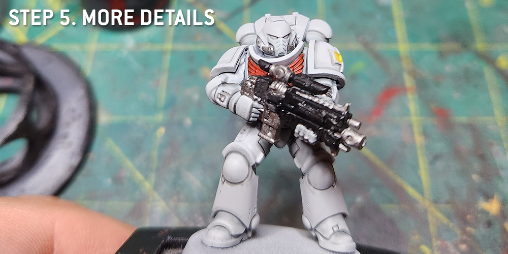For the bolt rifle, I just paint it with VMC Black, and use Citadel Iron Warriors for the metal. You can use Leadbelcher, however since I’m going for a clean look, I prefer to have the metal just a little bit brighter. I edge highlight with Dark Reaper and not grey- This way the edge highlight contrasts not only with the black, but with the white as well. If I used something with a strictly neutral shade, it could end up blending in with the white behind it… making its entire purpose wasted.