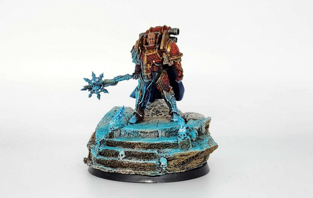 Lorgar's face I did with Cadian Fleshtone and washed with Agrax and Reikland Fleshshade, then highlighted back up with Cadian and Kislev flesh. The runes and scripture on his face are done with a Micron pen (.005).