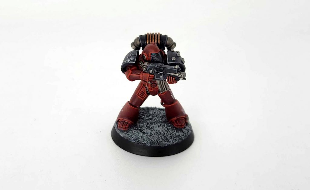 Once the red is dry hit all the black details with a coat of Black Templar Contrast paint. This includes the weapon casing, the soft parts of the armor (the undersuit) and any black armor panels you want. I paint my models in a mid/late Heresy look, with black pauldrons but if you like the all red look just hit them with Flesh Tearers.