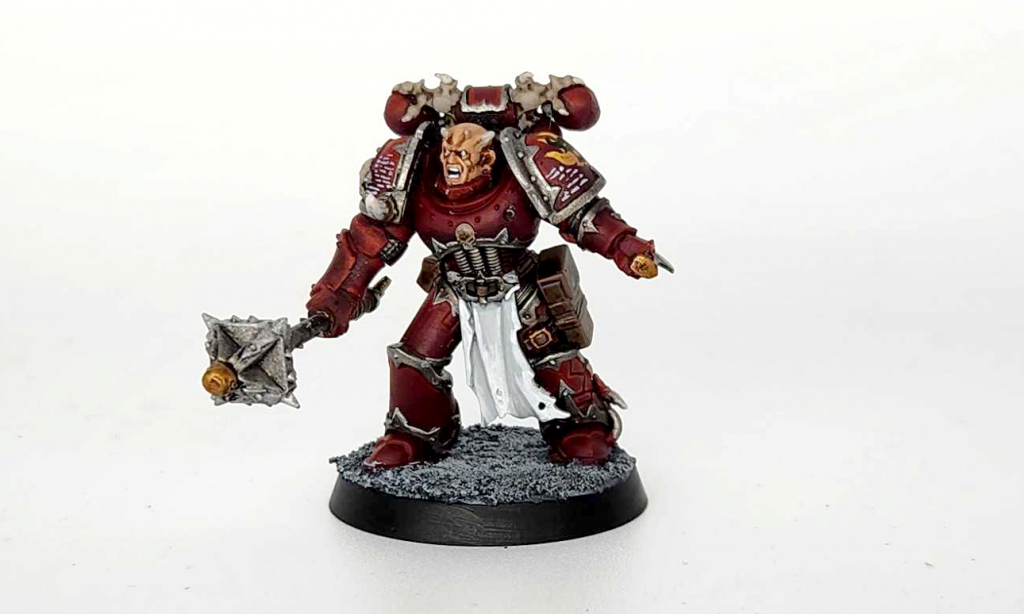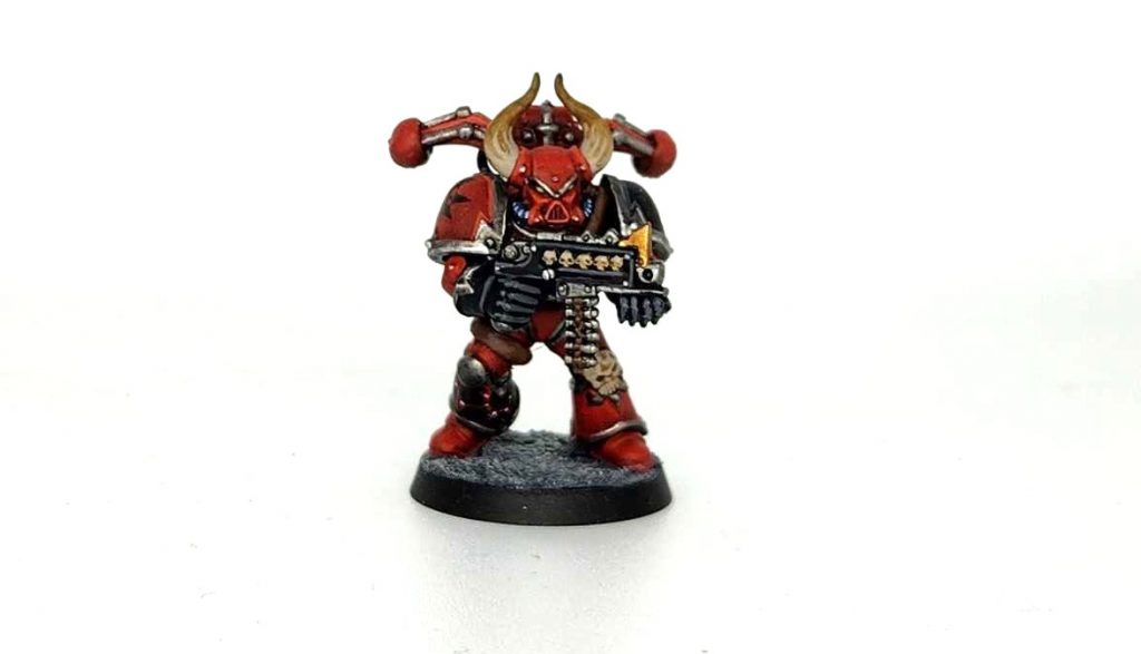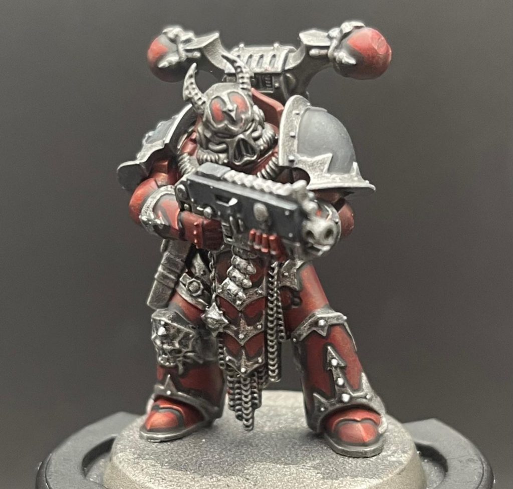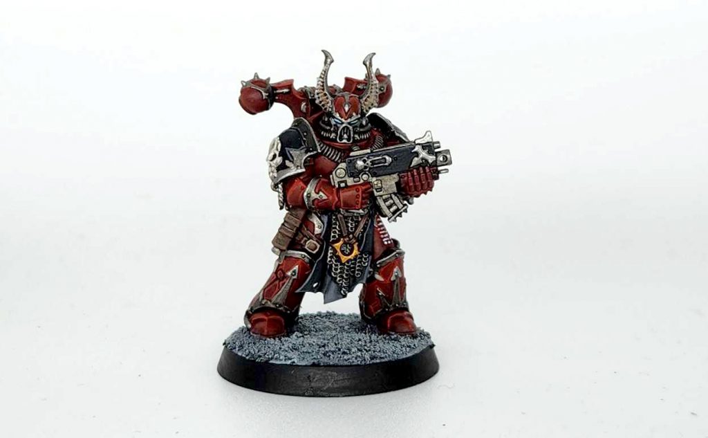 I started by painting the model Word Bearers Red, save the pauldrons, which I painted Abaddon Black.