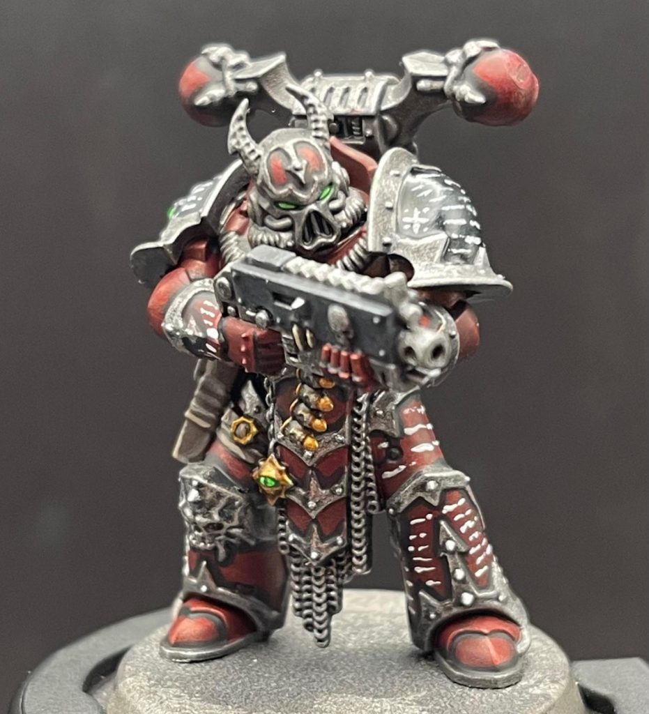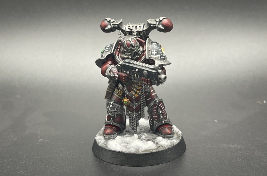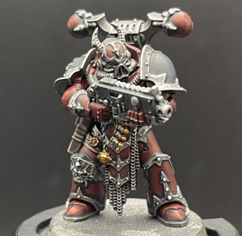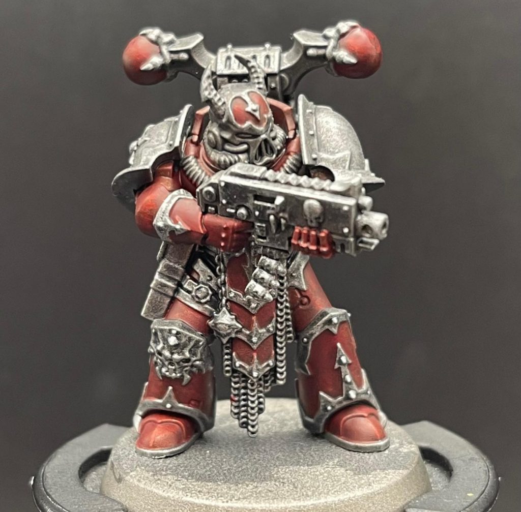 I started by painting the model Word Bearers Red, save the pauldrons, which I painted Abaddon Black.