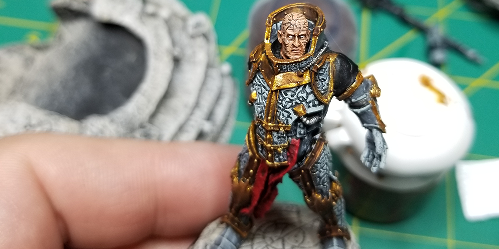 Now that the main colors are blocked in, we need to get some separation. Using Black Legion (you could use a black ink instead) paint along the borders of the armor where especially focusing on where the red or black meets the trim. I also like to hit between the fingers, this just helps you see the detail.This step takes a while, and you may overspill onto the trim. If/when this happens just tidy up with a touch of Ironbreaker.