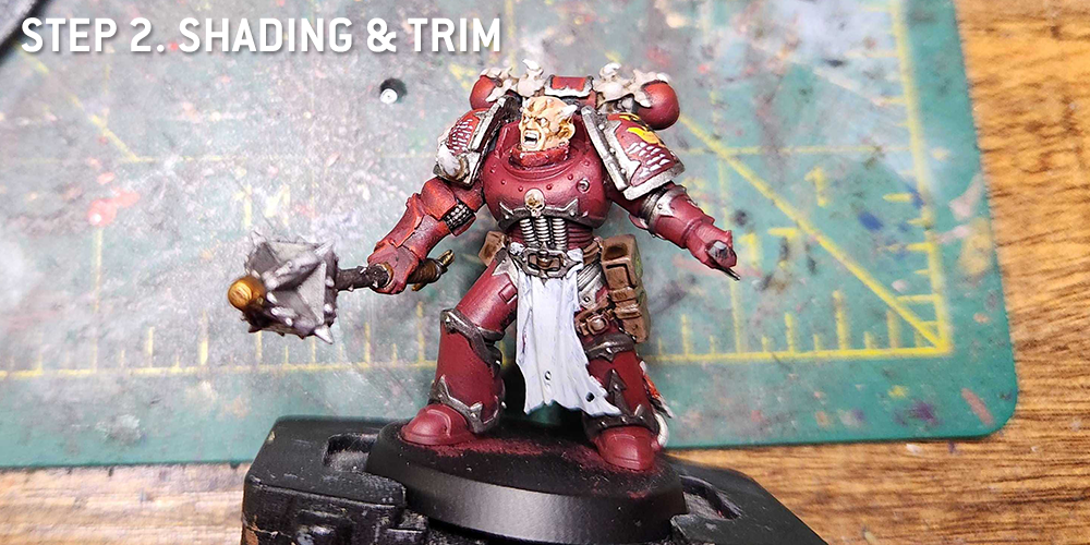 Next we're going to shade rather than highlight. In this case, that will mean progressively mixing Khorne Red with Gal Vorbak Red to shade parts of the model and darken them. Following that I'll shade the bottommost parts with Nuln Oil. The armor is edge highlighted with Mephiston Red.Next up comes the trim. This is painted with Leadbelcher, then shaded with Nuln Oil and highlighted with Runefang Steel.