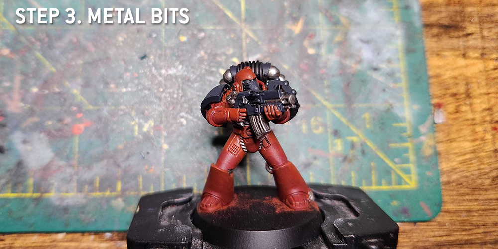 Now we block out the red armor panels with Flesh Tearers Red Contrast paint. This will show through the metallic undercoat and give you that Heresy-era look without any fuss. Getting a nice even coat is important as you don’t want the tide marks, but if there are some near the edges (close to trim) don’t worry as in the next few steps we will be covering that up anyway.