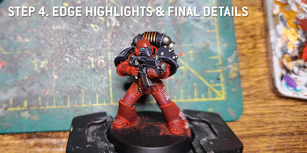 The process starts by painting your lines. I tend to use Black Legion Contrast for this, though if you want something a bit softer on red you can use a mix of black legion and Flesh Tearers Red instead. Make your thin lines, then it's time to come back and highlight them. We basically want to edge highlight the area around the lines as though they were raised parts of the armor. For my dark red armor, I used Mephiston Red for the first level of highlights, then came back in and used Evil Sunz Scarlet for the second set. For a more muted effect, a pinker shade would also have worked here, or even a light flesh shade.
