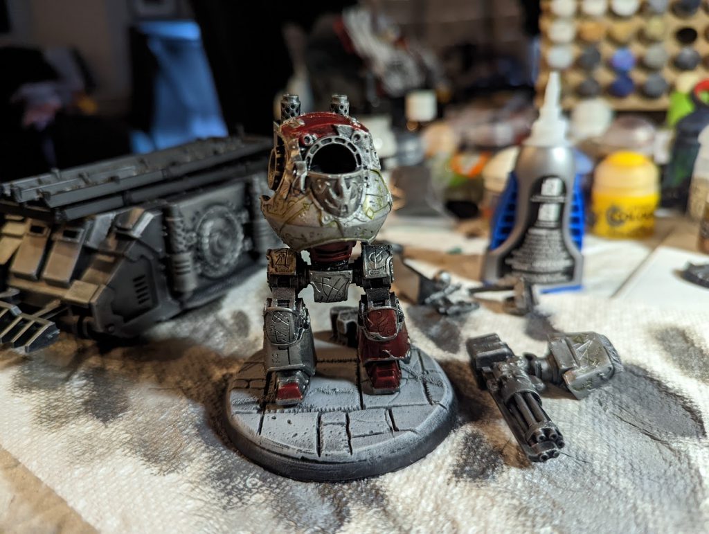 I'm pretty happy how he turned out, though I painted him a while ago. There are some things I'd probably touch up now, like adding sharper highlights on some of the corners, and I think I could do his face better. Overall still pretty satisfied with him, though.