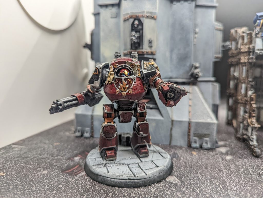 Onto the fun part, the Word of Lorgar.I like to start on a large panel, on power armor this is usually a shoulder or lower leg. I start at the top and stipple/draw lines of “text” across the panel. Then you repeat this with variation down the side, and then do the same to the opposite side. Throwing in some runes or concentric circles is also good, and I have a specific marking on each model that unites the force which I put on the left (the models left) shoulder pad. For my Warhost it’s a plus sign with dots in the corners, which is supposed to represent a constellation seen by Lorgar in the Eye of Terror, in the case of my army it’s the Maw of the Void. but this is totally optional.