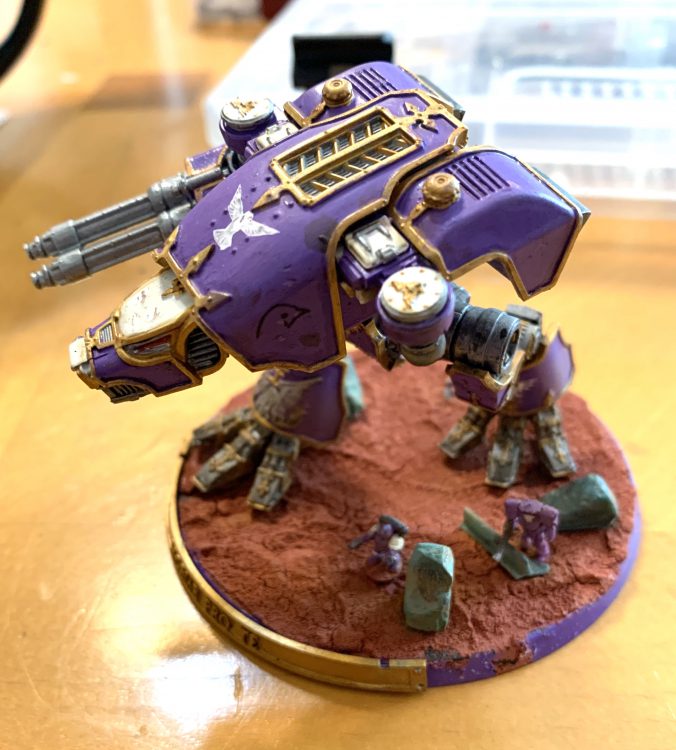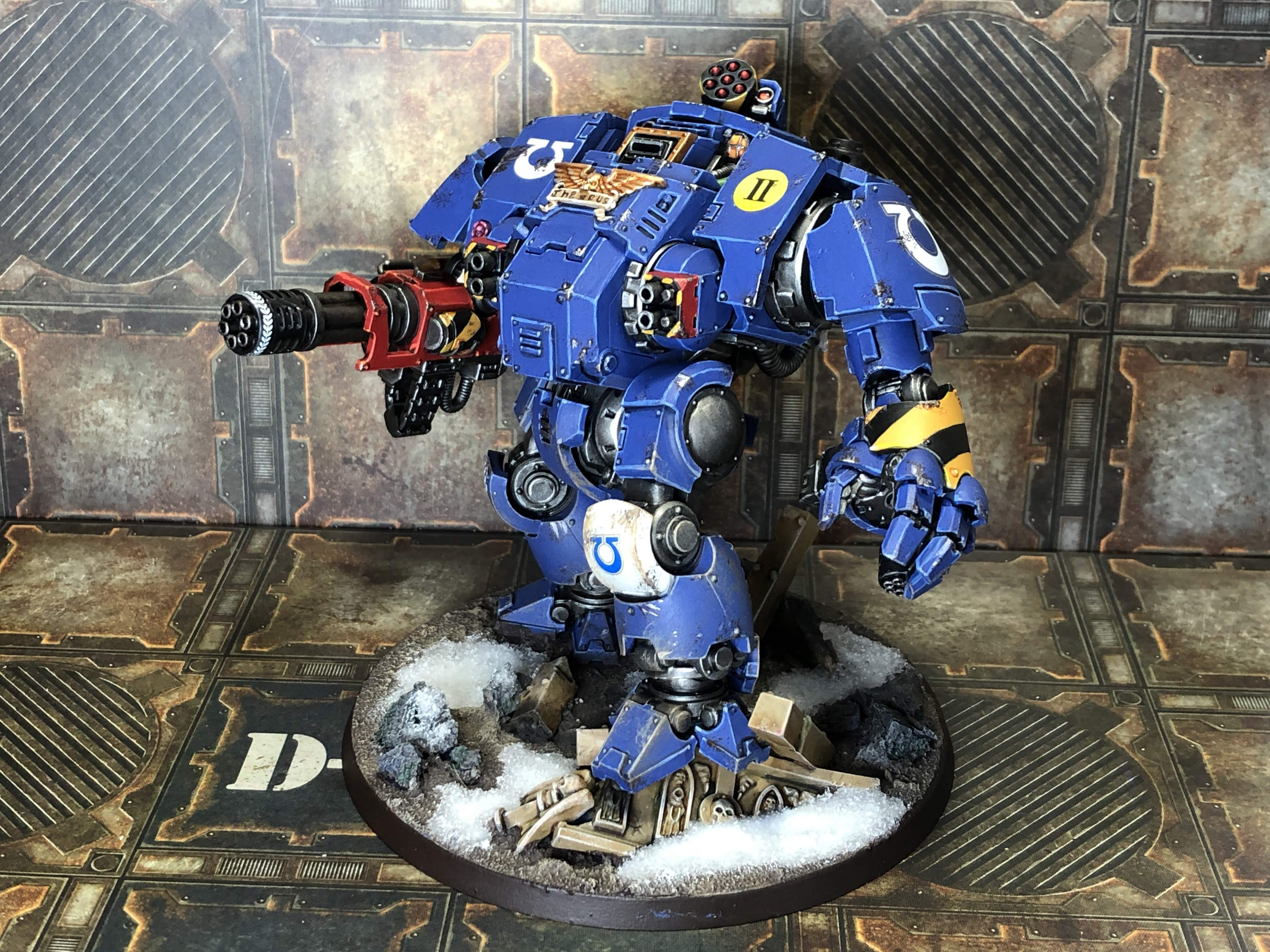 Redemptor Dreadnought. Credit: SRMThe last step towards really integrating transfers into your scheme is to weather them. As head58 said earlier, a pristine decal among all the grit and grime of your tank is going to look downright silly. If you're not weathering your model you don't really need to worry about this, but I'm a fan of sponging, drybrushing, and weathering powders. You can do this after varnishing, or be like me and do it right before. I find multiple coats of varnish can dull the colors of a model, and if you're using weathering powders you'll want to varnish afterwards anyway.