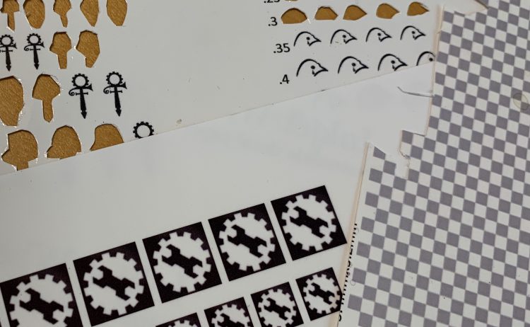 Homemade decals - for when you make a joke Titan legio, choose a chapter with no official decals, or just hate painting checkers.You can get waterslide decal paper online or possibly at an office supply or craft store. It’s used by normals to put designs saying “Live, Laugh, Love” on mugs and vases and the like. Gross. The paper comes in standard printer paper sizes, and if you buy a decent sized pack and you may be all set for years, so go ahead and splurge on the best quality paper you can find.