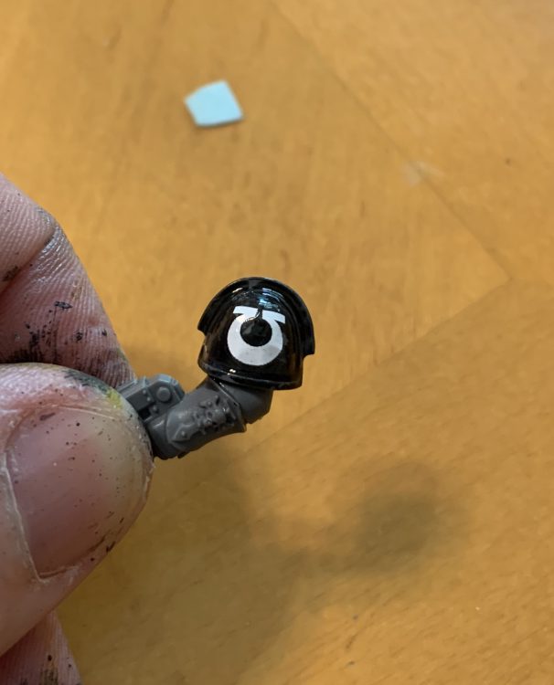 Transfer applied to the pauldron. There’s a small wrinkle on the right side I will flatten with more Micro Sol and a moist paper towel.If the place you’re putting the transfer has an unusual surface, like a lip or something you want the decal to bend over, put on a little Micro-Sol and that will help the film be more flexible. I don’t use Micro-Sol very often - you don’t really need it for shoulder pads or rhino doors or surfaces like that.