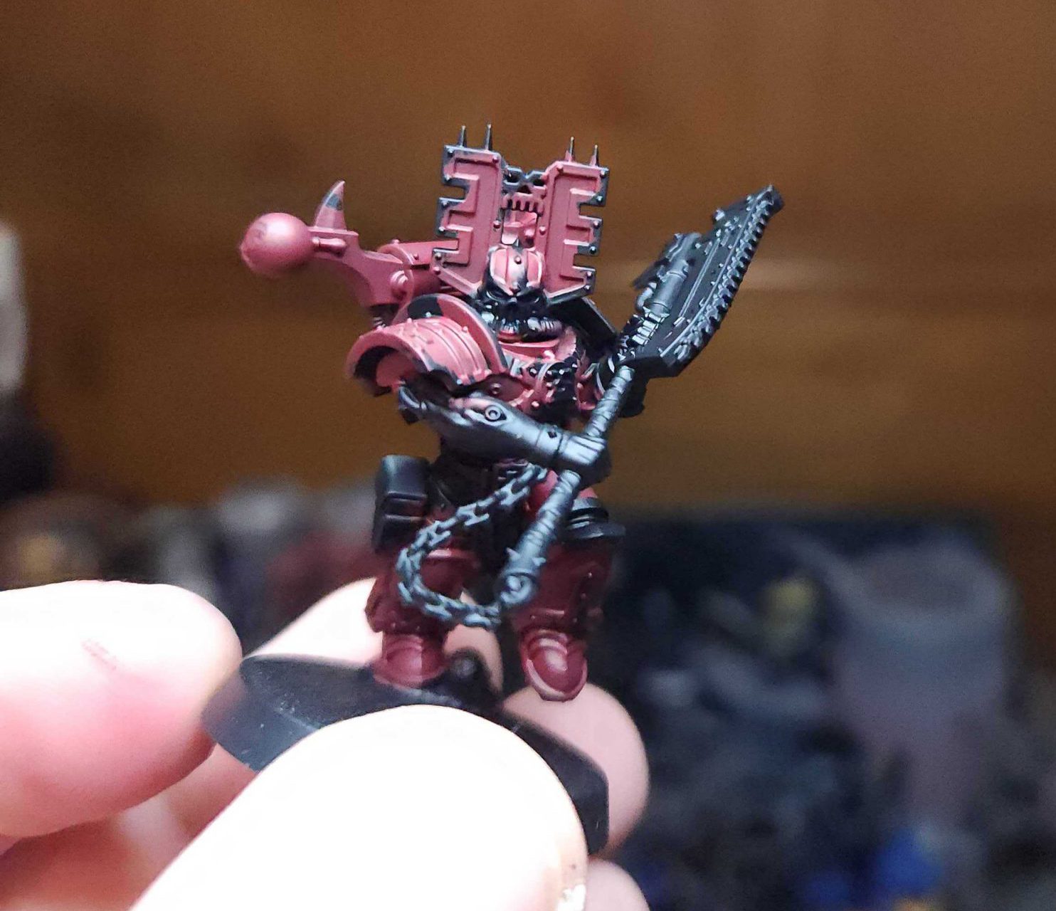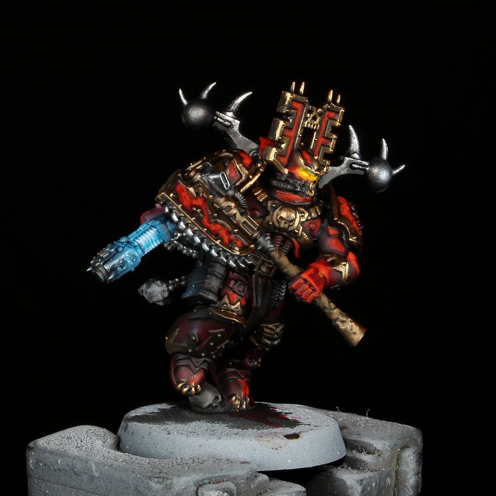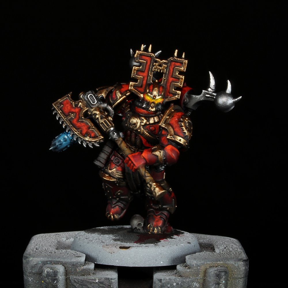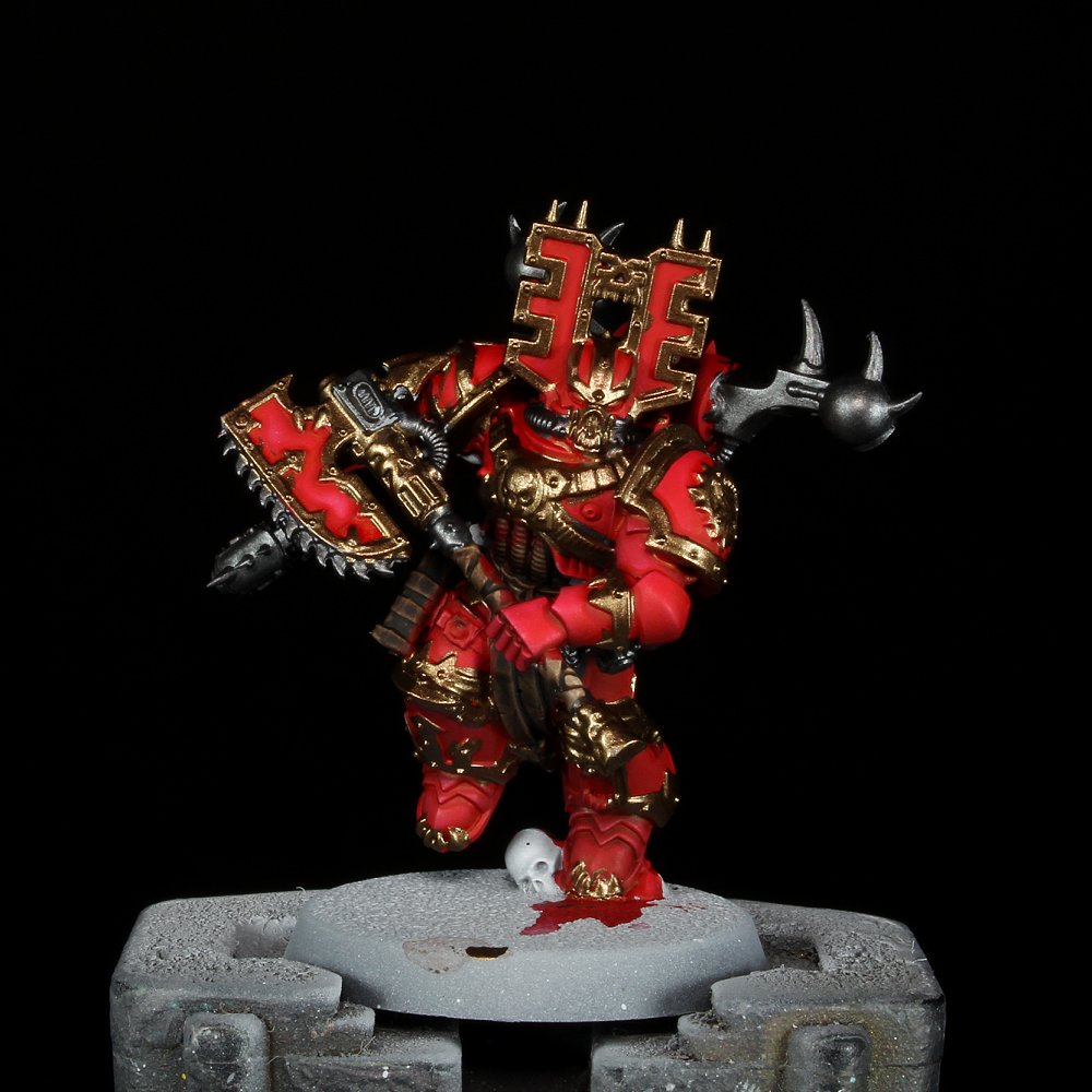 The World Eaters have a fairly simple paint scheme - red armor with brass or gold trim. They don't sport any complex heraldry, or really any heraldry at all - at best, they have legion iconography and marks of khorne, and that's about it. That said, keeping the army interesting visually with a simple scheme can be a bit of a challenge.