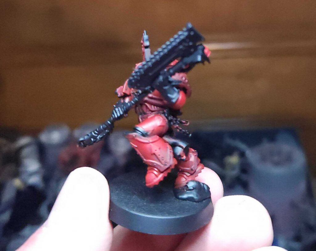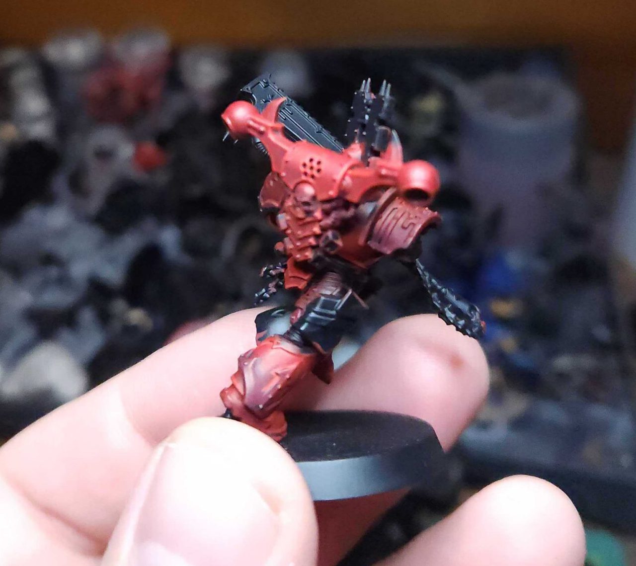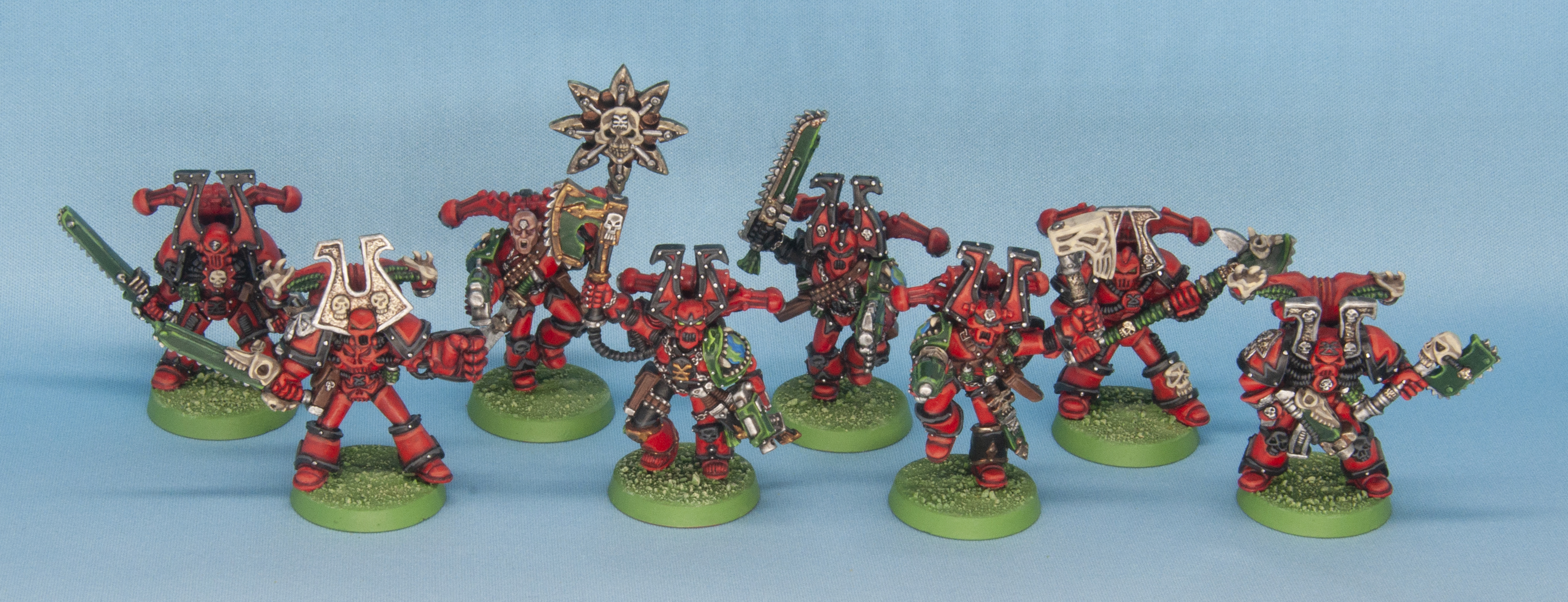 The World Eaters have a fairly simple paint scheme - red armor with brass or gold trim. They don't sport any complex heraldry, or really any heraldry at all - at best, they have legion iconography and marks of khorne, and that's about it. That said, keeping the army interesting visually with a simple scheme can be a bit of a challenge.