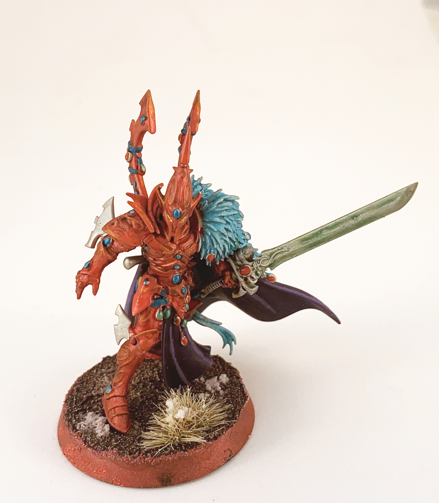 Credit: Liam "Corrode" RoyleI don’t do anything particularly fancy priming wise - no zenithals or special base coats or anything here! Just straight up Army Painter Uniform Grey, because I like working on grey as a compromise middle ground between black and white. I should also point out that I almost never sub-assemble anything - I build the whole damn model and paint it like that, attached to the base it’s going to live its life on. This makes painting a little more challenging, but at my standard it’s fine. If you’re thinking “how did you do the cloak without messing up the armour” - basically what I do is block in the base colours, taking care but ultimately not worrying too much if it’s a little messy, and then clean up afterwards. After that, when you’re doing finer work, and taking commensurately more care, you should be ok. If you can’t get your brush in somewhere, that probably means no-one is ever going to look there, so the most important thing is just that the base colour is blocked in (so that there’s no unsightly primer showing through etc.)As you read through this, then, assume that my process was not “paint this whole section, then this whole section,” but instead “put down all the base layers described, then clean them up, then put down the secondary layers, then clean up if necessary, then move on to the finer details.” For the main area of the armour, I started at Khorne Red, then layered on Mephiston Red, then Jokaero Orange. After the Jokaero went on I thought I’d made a huge mistake, since I wanted a redder tone, but the answer turned out to be Carroburg Crimson - washing the armour with this gave it a nice depth and brought it back down towards brick red, exactly the tone I wanted. I hit some raised areas with Jokaero Orange again and edge highlighted the helm, the knee armour etc. and then did a final corner highlight on the highest points with Troll Slayer Orange.The golds were all Gehenna Gold, then Auric Gold, washed Reikland Flesh, and then re-layered with Auric before a final edge highlight of Runefang on the highest points. The gems got much the same treatment before I then went back and blocked in two tones of colour on them. Just in terms of the gems, because there are so many and I was liable to miss some, I sat down with the GW website open in front of my monitor and just rotated the Visarch around in the 360 view, copying the colours they’d used for them. This sounds mad, but it’s a helpful way to take care of a slightly overwhelming part of the model, and make sure you don’t miss any. For the other metal parts, these are just based Leadbelcher and then layered Ironbreaker.The cream cloth was all Rakarth Flesh, layered up with Flayed One Flesh and then Screaming Skull, with Seraphim Sepia washed into the recesses and then tidied up with Screaming Skull again. The belts and the soft parts of the armour are VMC Black Grey, with an edge of Mechanicus Standard Grey.The fur on the cloak and the little cloth cords tied around his shoulder… things and holding some of the gems were done more or less the same, with a base layer of Mechanicus Standard Grey, then a couple of layers of Ulthuan Grey under VMC White for a smooth finish. The fur was then washed with Drakenhof Nightshade to give it a blue tone, then relayered with Ulthuan Grey followed by VMC White.You can see what I mean about there being lots of bits and pieces to this guy! We’re in the home stretch now- just the cloak, the sword, and the sash. The sash was simply Naggaroth Night, then a layer of Xereus Purple covering most (but not all) of it, and then another layer of Genestealer Purple covering less again, and then finally Emperor’s Children pink on the tips.The cloak is Macragge Blue, then raised areas hit with Altdorf Guard, a finer layer of Calgar Blue, and then recesses washed with Drakenhof Nightshade.Finally there’s the sword. This is probably the only part of the model that’s actually technically impressive! Along either side of the blade, I started from Kantor Blue, and then wet blended up through Macragge Blue, then Teclis Blue, then Lothern, then Baharroth Blue, and then back out again on the other side. For the back of the blade I simply reversed, starting lighter and getting darker towards the middle. To finish, I applied a thin highlight of VMC White along the centre of the blade, then glazed the whole thing with thinned down Drakenhof Blue.All that’s left after that is a quick matte varnish (Testor’s Dullcote for life), some ‘Ardcoat applied to the gems to make them shine, and then some grass and some Gamer’s Grass flowers which I’m using to tie my Eldar together.That’s it! A bit of a marathon to write down, but surprisingly quick to achieve.