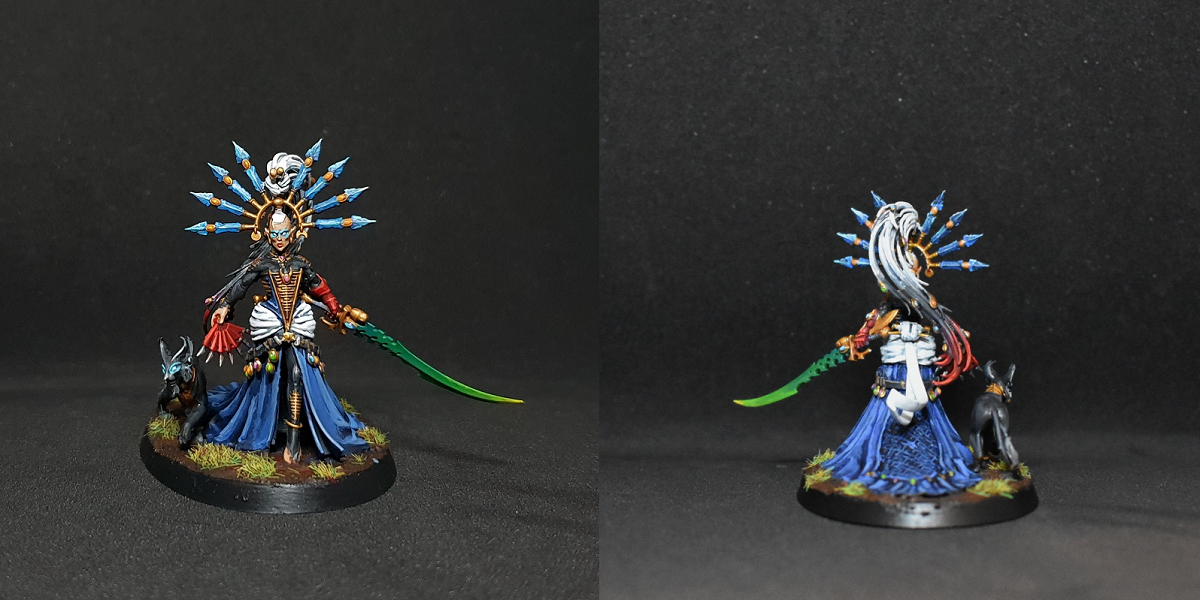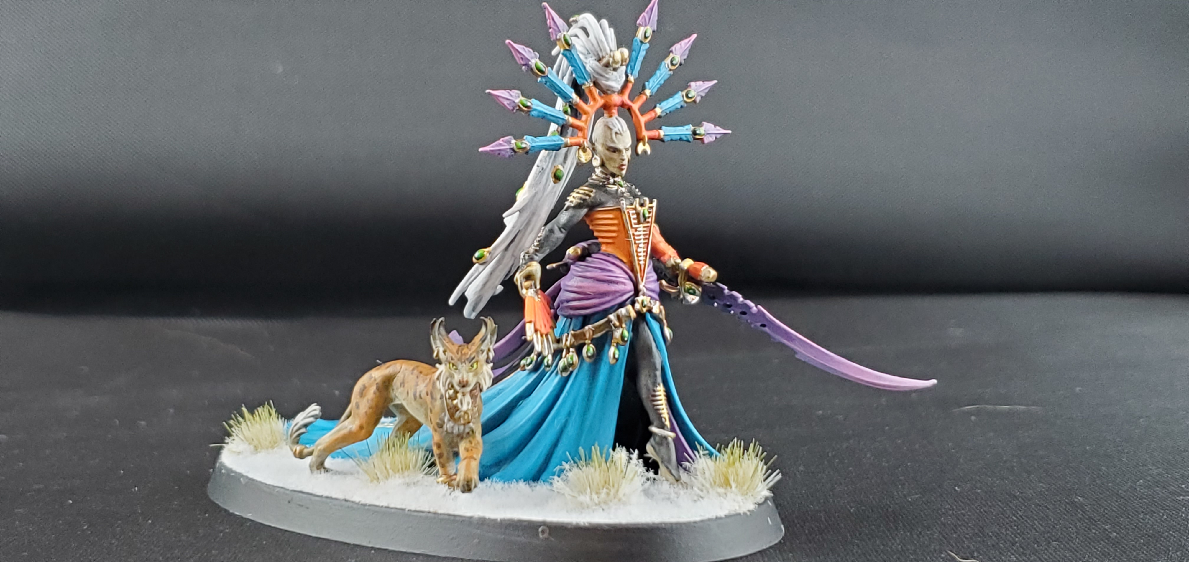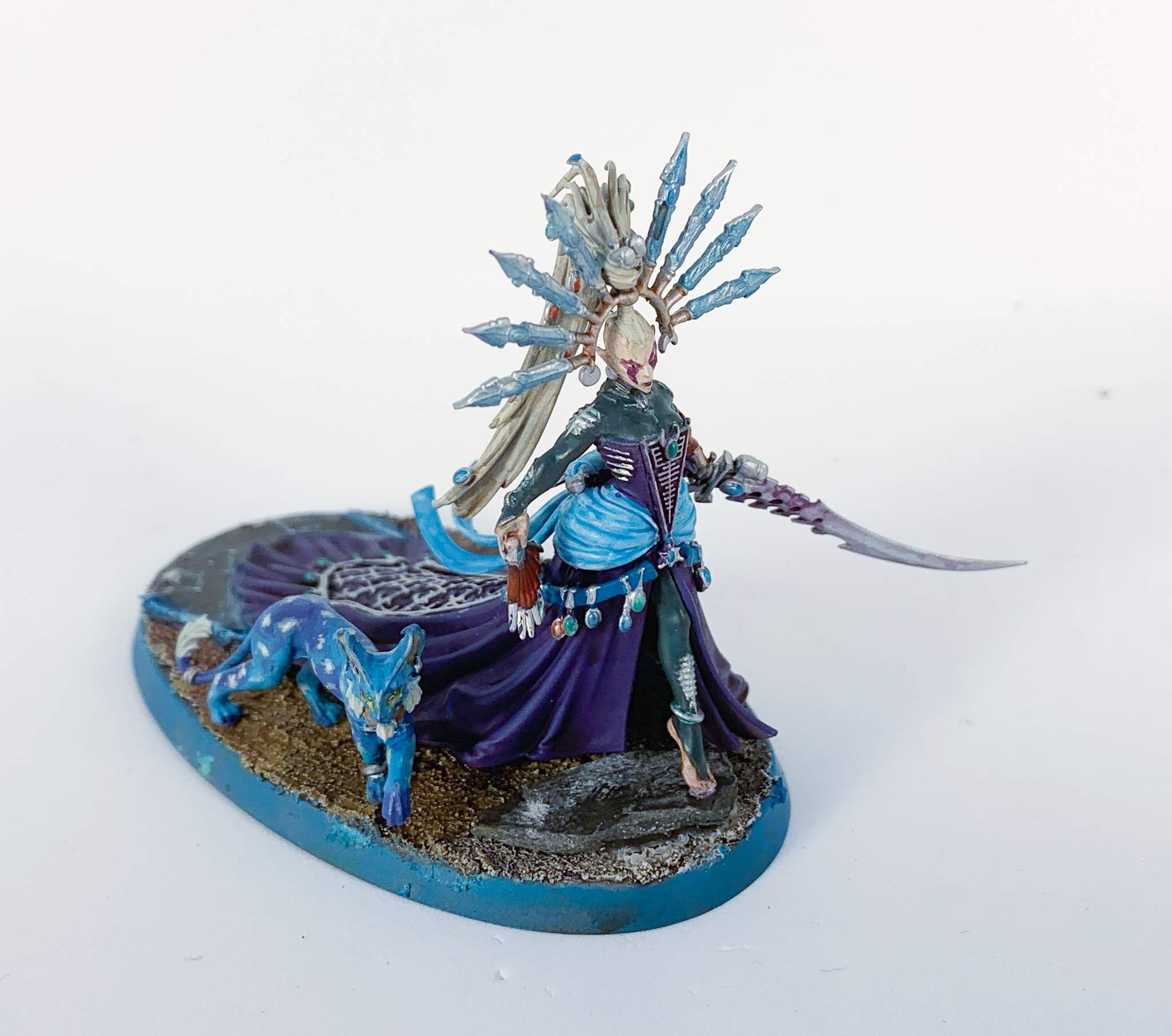 Credit: FlavivirusI painted her skirts, body, and headpiece separately. For the bodysuit, I primed black, coated the bodysuit with a transparent green glaze (2:1 Lahmian Medium and Kabalite Green).and then the whole thing was hit with a green wash. The corset and upper body was based with Xereus Purple, then washed with Druchii Violet. The ridges on the suit were picked out by drybrushing with VMC Silver, and the soulstone on the corset was given a coat of Waystone Green.The flesh (hands, feet, head) was based with Pallid Wych Flesh, washed with a little bit of Reikland Fleshshade, and then highlighted with a 1:1 mix of Pallid Wych Flesh and VMC Dead White. For her face, I used Genestealer Purple put on reasonably thick to get that facepaint look, and freehanded a diamond round one eye, a lightning bolt coming down from the other one, and (very lightly) a touch of purple on the lips. The same colour was used to dot the pupils.The fan was painted with Evil Sunz Scarlet and washed with Reikland Fleshshade, will the sword was based with VMC Silver and then glazed with a 1:1 mix of Lahmian Medium and Genestealer Purple.For the skirts, I primed them grey and then basecoated with Xereus Purple, highlighting with progressive mixes of Xereus Purple and Genestealer Purple, finally washing with Druchii Violet. The net on the back of the dress was picked out with VMC silver on a thin brush, and the soulstones were then hit with Waystone Green. For the sashes around her waist, I based them VMC Dead White and then glazed them with a 1:1 mix of Ahriman Blue and Lahmian Medium, to try and get as much of the brightness through as possible while maintaining the colour. Finally, the belt was based with VGC Falcon Turquoise, and the soulstones were picked out with VMC Silver and then coloured with a range of transparent paints - Waystone Green, Soulstone Red and Tamiya Clear Blue.For the headpiece, I started by basing the hair with Administratum Grey, and then washing with Agrax Earthshade. Then the hair was drybrushed with Flayed One Flesh to get the blonde look. Hair pins and soulstones in the hair were picked out with VMC silver, with the soulstones getting gem paints as above. The metal arch of the headdress were based with Runelord Brass, and then washed with Reikland Fleshshade; the arrows were based with VMC Silver, and then glazed with the same 1:1 Ahriman Blue/Lahmian Medium mix used for the sashes.For the base, I only started working on it once Yvraine was finished to make sure of the proportions. I trimmed off the little disk on her front foot, so needed something else to lift her up; a small rock from a box of basing bits worked well. I also marked down with pencil where her trail of stars should go.Next, I coated the base with Vallejo Sandy Paste, and scraped it away from the areas where I wanted her trail to be. After it had dried, I covered it with various layers of thinned Gorthor Brown, Tallarn Sand, and Agrax Earthshade to get a good mottled ground look, finally drybrushed with Tallarn Sand. For the trail, I based it in Abbadon Black, made dots for stars with VMC Silver, linked the stars into constellations with Temple Guard Blue, and then put a glow down on the edge of the trail with a line of Ahriman Blue and then a thinner line of Baharroth Blue. Finally, placed Yvraine on the base and then coated all the trail with a thin layer of Vallejo Still Water to give it a bit of sheen and depth.Finally, the cat. This was pretty simple - base Ahriman Blue, put some blotches of VGC Falcon Turquoise, then some spots of VGC Bone White on the coat, and on the tip of their tail and their whiskers and inside the ears. The eyes were given a yellow glow with VGC Sun Yellow, and the rings on their paw, tail and ear were painted in Runelord Brass.Problem Areas/Things to AvoidThe headpiece was a real faff - and sure enough, within a few games of use had snapped off completely. If you can, pin it from the top of her hair into her head when you assemble and it might save you trouble.Things I'd Do DifferentlyPicking out the raised bits on her bodysuit was definitely the wrong call, I’m not a fan of how blotchy it looks. Probably drybrushing would be a better call. Also, her sword doesn’t look good; I’d probably follow the advice in HTPE: Power Weapons if I wanted to do it again.