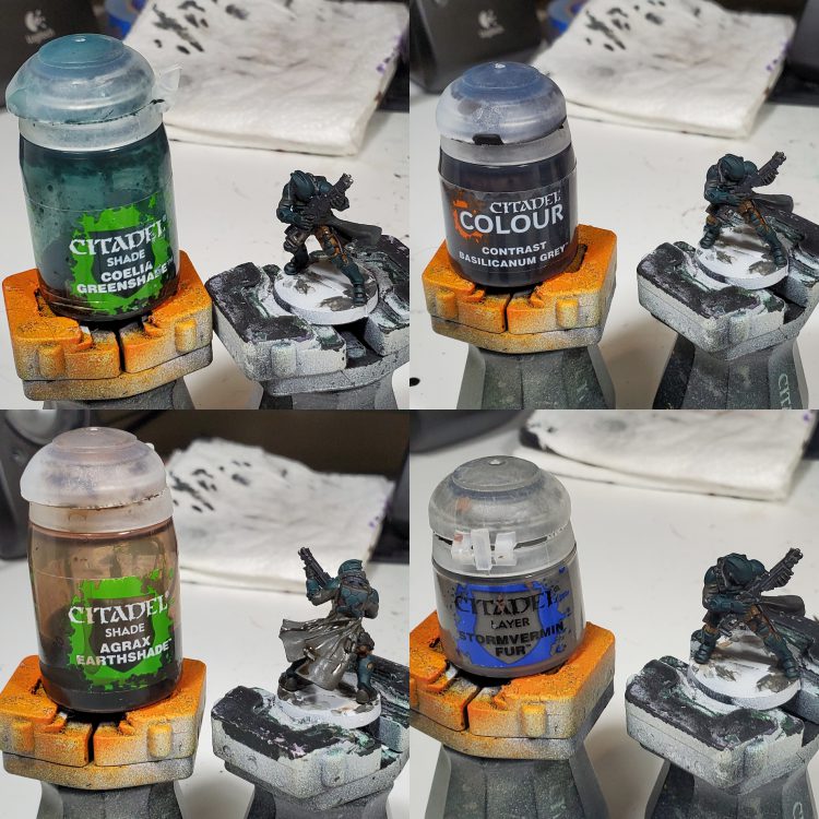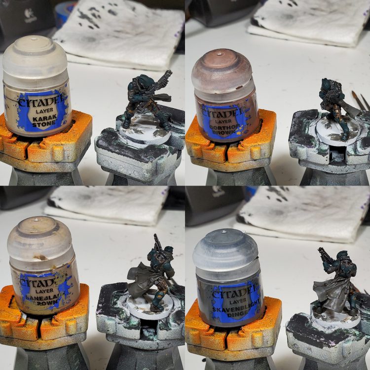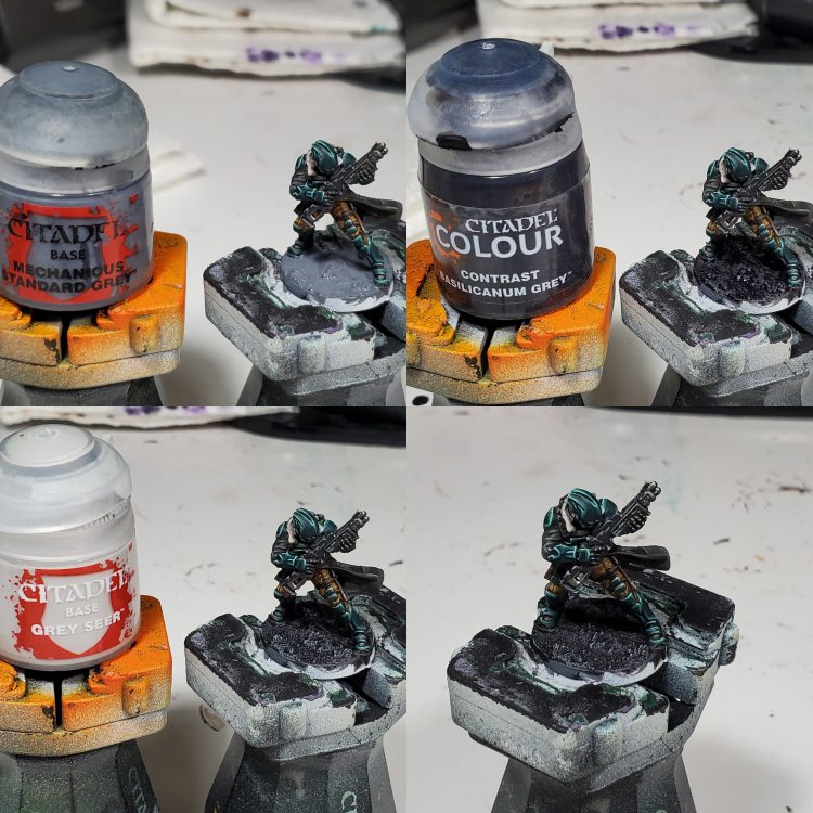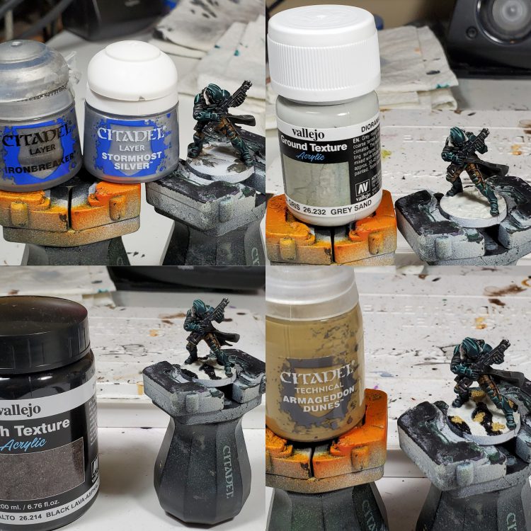 I was previously just using stormhost as a metallic highlight in this scheme but I decided it was a bit stark for my preferences, so I went back to pull back the highlights with some larger areas of ironbreaker. For basing, I recently found that using a mixture of different basing pastes to get the implication of different sizes of gravel and rocks can really work with smaller models to get away from models looking like they are on a uniform plane from a distance without having to add a bunch of distracting stuff.