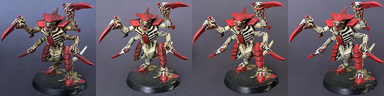 This starts with a Basecoat of Wazdakka Red, after which I raise most areas with a mix of 50/50 Wazdakka Red and Evil Sunz Scarlet, then I further raise larger areas with 25/75 WR/ESS. Next I hit the entire thing with a wash of Agrax Earthshade and allow that to dry after ensuring there's no pooling. Then I go back over raised areas with Evil Sunz Scarlet, repeating a few times in smaller, higher areas to raise up the color. I edge highlight the plates with a 50/50 mix of ESS/Fire Dragon Bright, possibly going over larger plates in raised areas a few times to make them pop. Finally, I go over the recesses in the plates with your wash very delicately with a fine brush, ensuring I'llĀ have a nice solid line delineating the two. While you're at it, this is a good time to go spot-check the model and see if there's any other places where a detailed application of wash might fix errors/deepen the look.For eyes/toxin sacs, etc., I use a basecoat of Warpstone Glow and a dot or two of 50/50 WG/Wraithbone. There's usually very little to these spots. Wash the edges around the eyes if you can, but the area is tiny so take care not to swamp it. Here's a quick example of the layering process. While I described the skin and chitin separately above, you'll see that I do both at once which allows me to clean up errors more quickly.