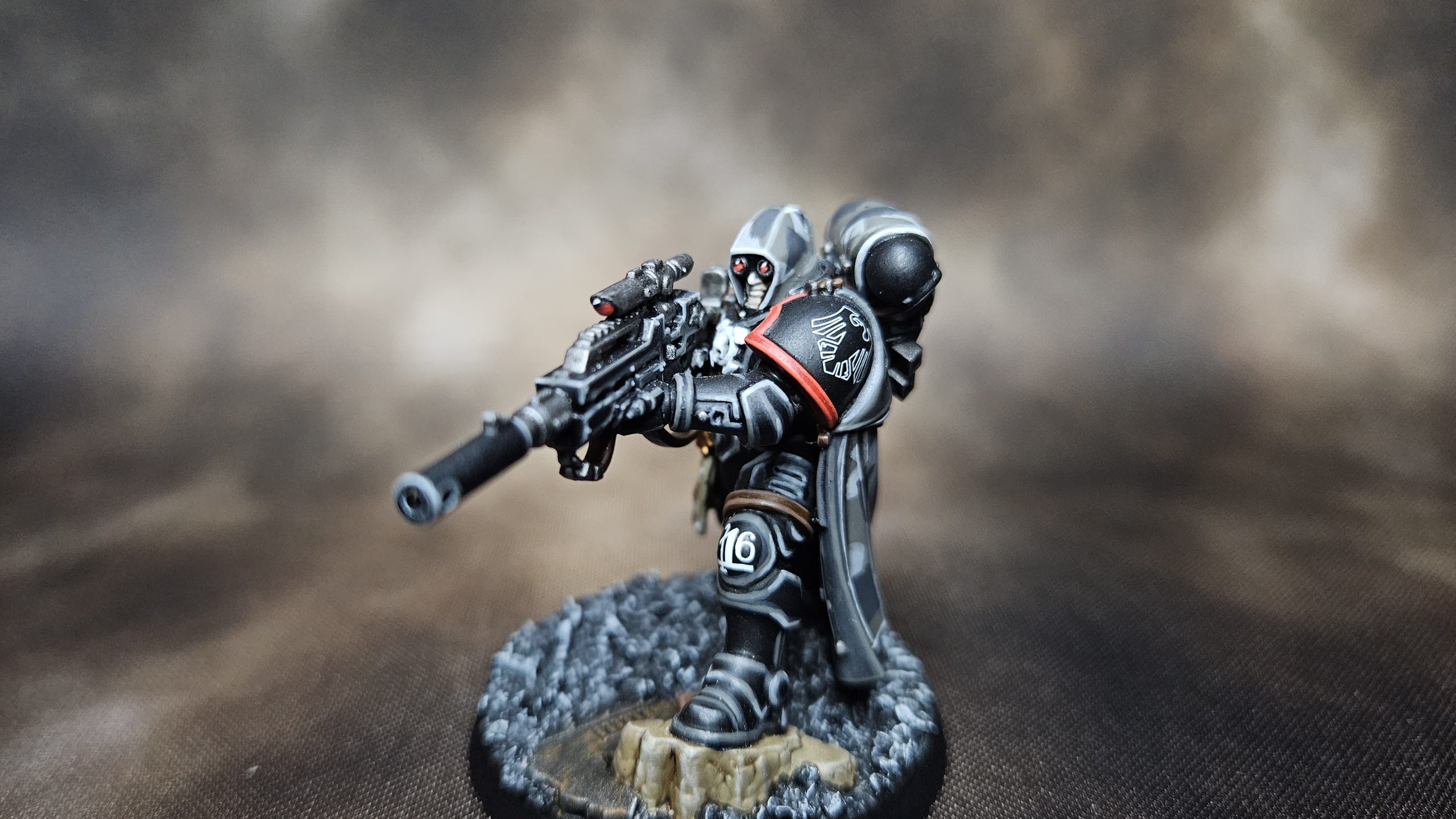 Here, on the finished model, you can see the 3rd highlight of Administratum Grey. If you keep it on the corners and especially raised edges, it will give you the contrast and sharpness you're looking for.