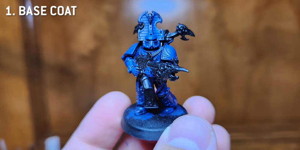I prime my Thousand Sons black, then I basecoat the armor with a coat of GW's Kantor Blue.