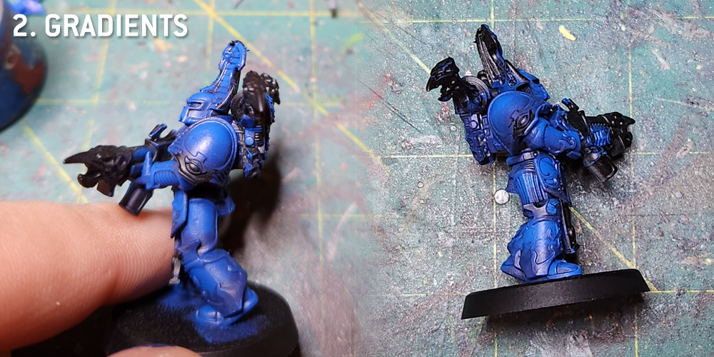 Now it's time to apply the gradients. This is done by mixing Kantor blue with Caledor Sky in several steps, and doing a kind of "wet drybrush" on the model in several passes with a brush. Usually I do 3-4 steps here, mixing 3:1 Kantor:Caledor, then 2:1, then 1:1, 1:2, and 1:3. When I'm done I'll hit the top areas with pure Caledor Sky and use Drakenhof Nightshade around the lower parts of the armor to create that dark line separating the armor and the trim. It's a hard effect to photograph, but I think the above photo shows off the final effect when I'm done. I do this everywhere there's blue, though note that it's meant to be top-to-bottom, so parts with Kantor will be lower on the model and not necessarily just toward the trim.