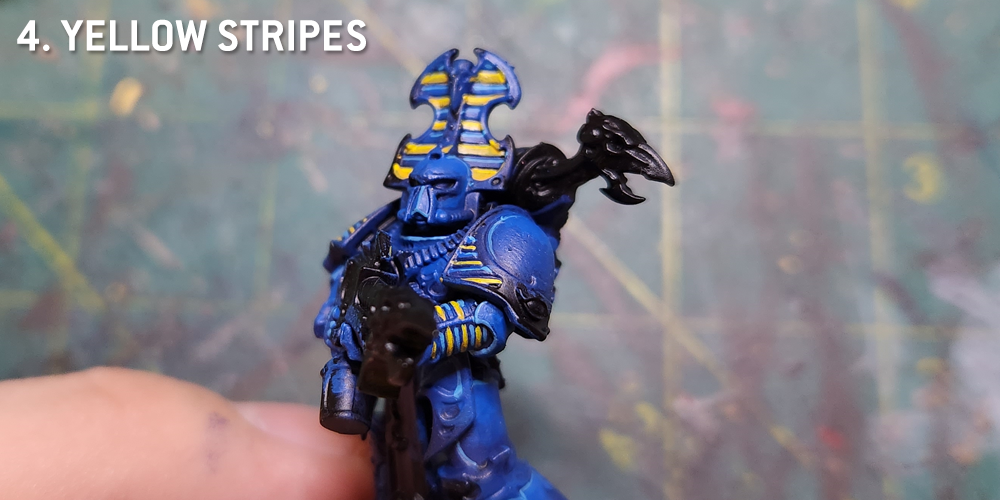 Speaking of which it's time to paint the stripes. This is the same as the GW method - I paint the stripes with Averland Sunset, then I edge highlight those stripes with Flash Gitz Yellow.