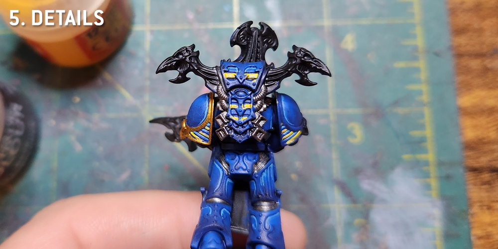 When it comes to painting the Thousand Sons there are two schools of thought: In one, you base the model gold and paint the armor panels, and in the other you paint the armor first and then paint the trim. There are advantages to both, but I prefer to do gradients on my armor paneling that makes it very difficult to do the trim first without painting over it. So I just base my models black and start from there.
