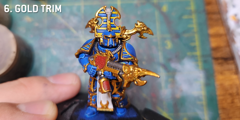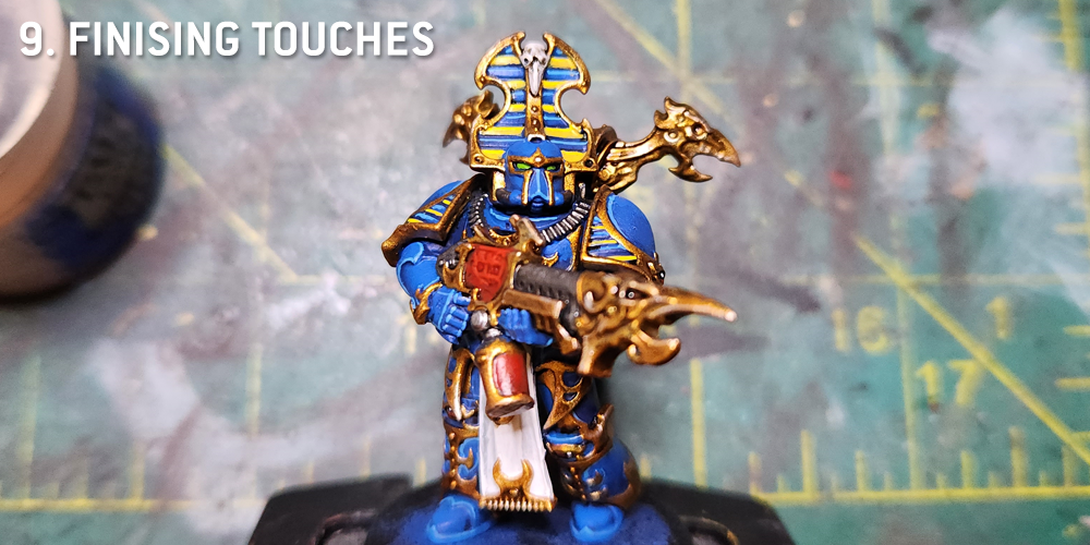 Now it's time for the finishing touches. The eyes are painted with Moot Green, while the red parts of the gun are highlighted with Evil Sunz Scarlet. I'll go back in this step and highlight parts that need it, hitting the skull with Rakarth Flesh and Reaper Polished Bone, while the gold trim I'll highlight with Liberator gold and Runefang Steel on the raised edges.There are a few extra steps you can take from this point to further improve the model - I've started adding corner highlights to my Thousand Sons minis, adding dots of Reaper Ghost White to spots on the armor with corners, adding a second layer of highlights to my Lothern blue panel lines. I also paint on the shoulder icons at this point, as I do not like to use transfers. These are done with Averland Sunset and highlighted with Flash Gitz Yellow.
